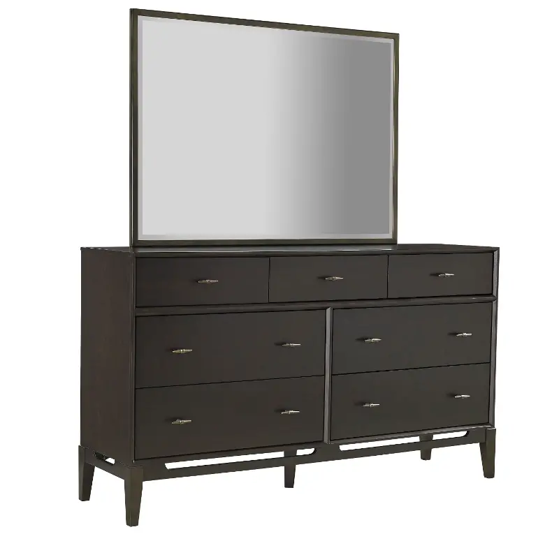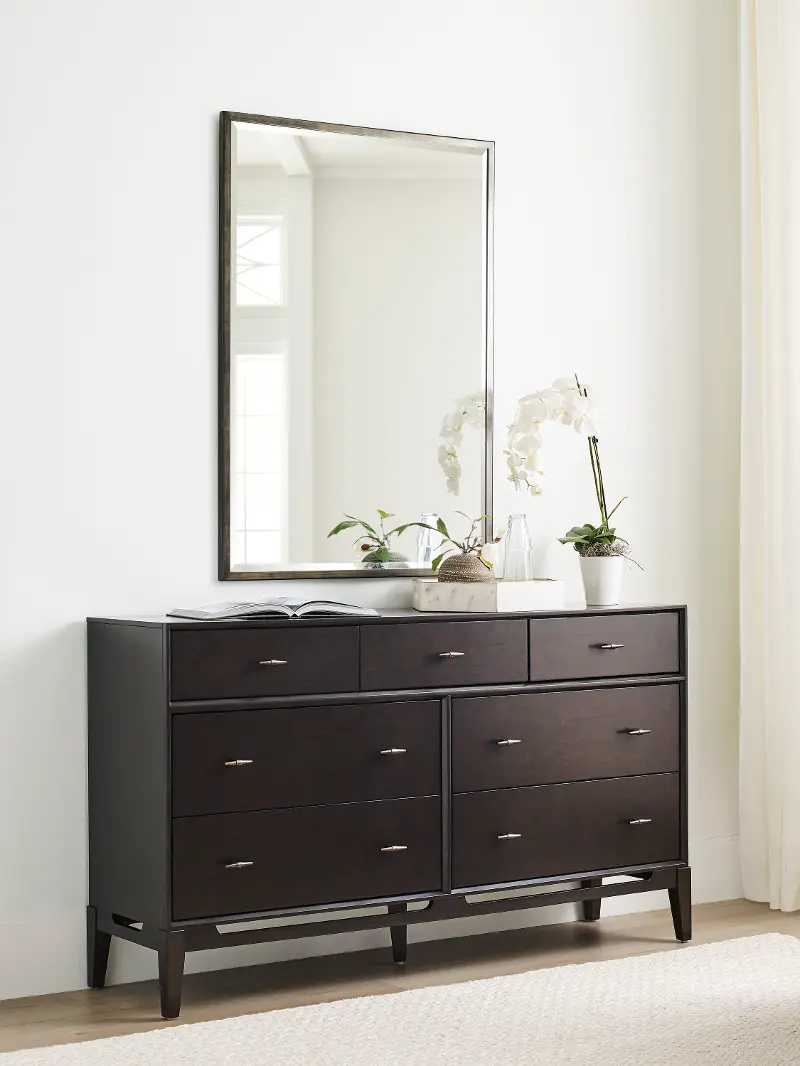 Solidly built, this dresser is finished in a deep French Roast brown and paired with burnished bronze hardware, while cutouts along its base enhance its contemporary charm.