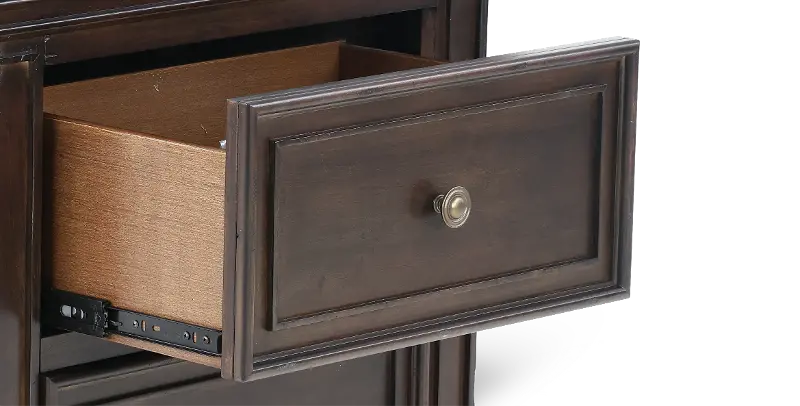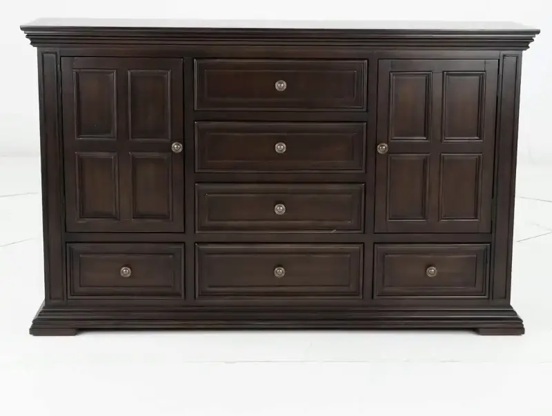 This dresser is crafted from rubberwood solids with birch veneers and features a brownstone finish with heavy distressing, while wood framing and graduated bead molding further enhance its eye-catching character. The dresser's 6 drawers and 2 doors with an adjustable shelf behind each door provide generous storage space.