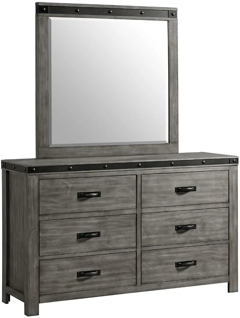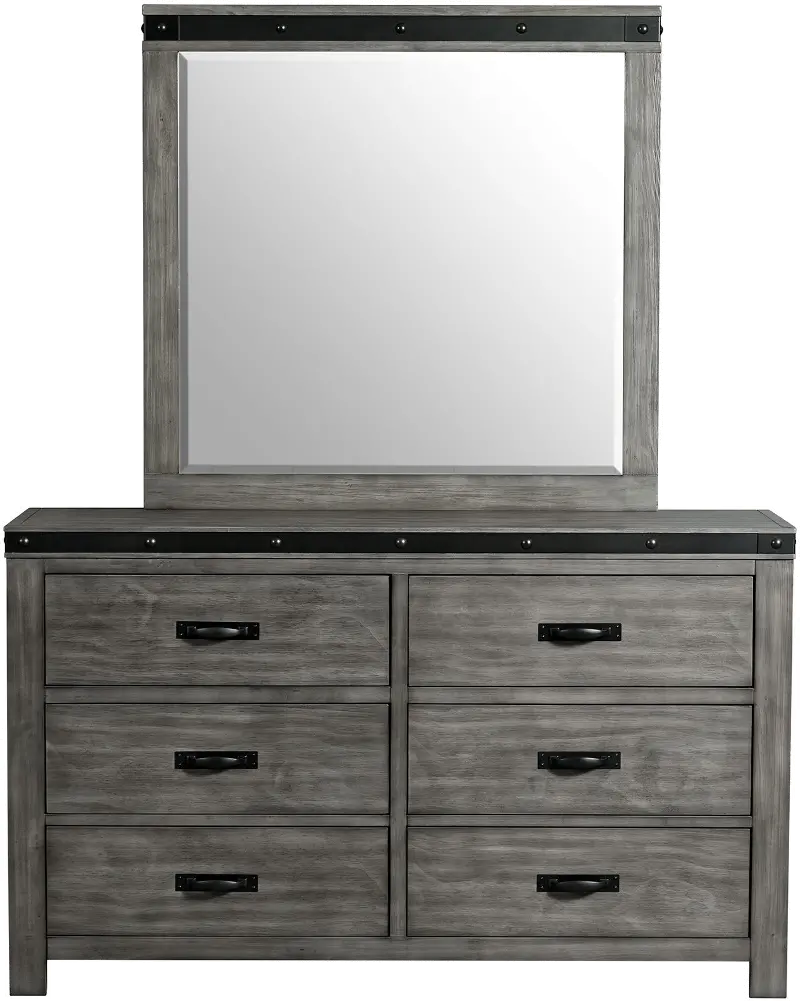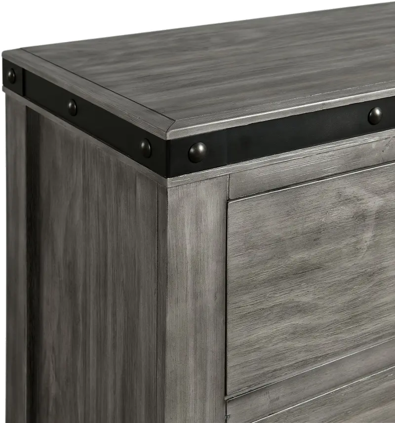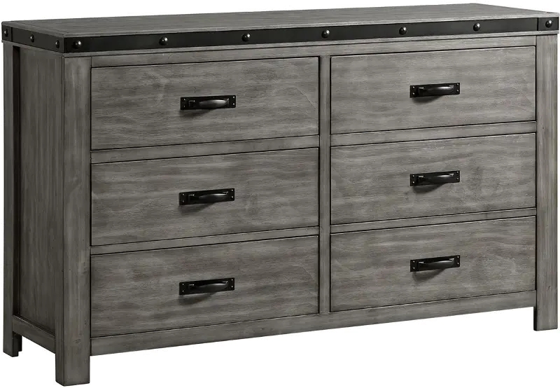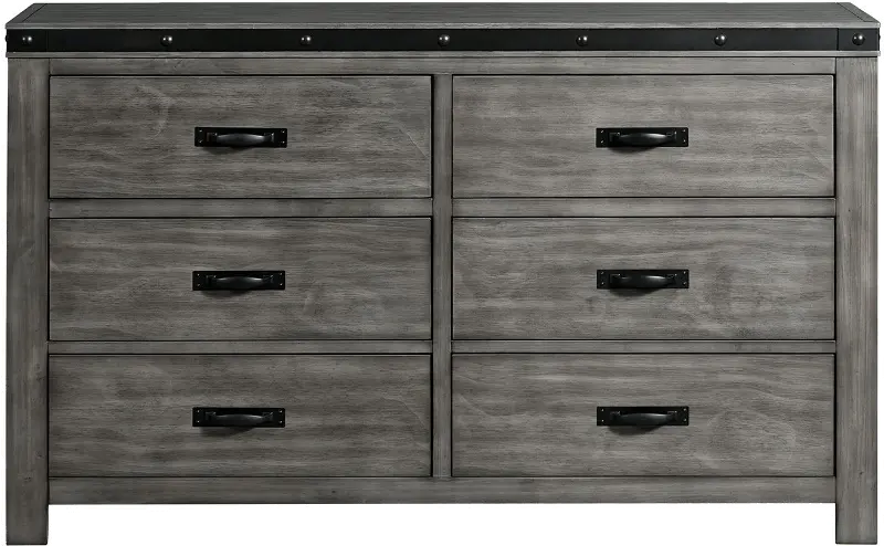 The dresser's clean lines are finished in a versatile gray wood hue that is handsomely complemented with brushed metal straps, adding a touch of industrial flair. Its 6 drawers provide generous storage and feature smooth-operating metal glides with a built-in stopper.