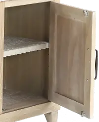 Design and style can be yours with the Rivan collection. This uniquely shaped bookcase pier is intended to be placed on the left-hand side of the Rivian Fireplace TV stand. The wheat-colored angled frame and light gray top are accented by darker hardware for contrast. Three open shelves offer ample room to display your books, plants, and decor. A roomy bottom cabinet helps keep wires and consols neatly tucked away. Add other pieces from this collection to pull it all together.