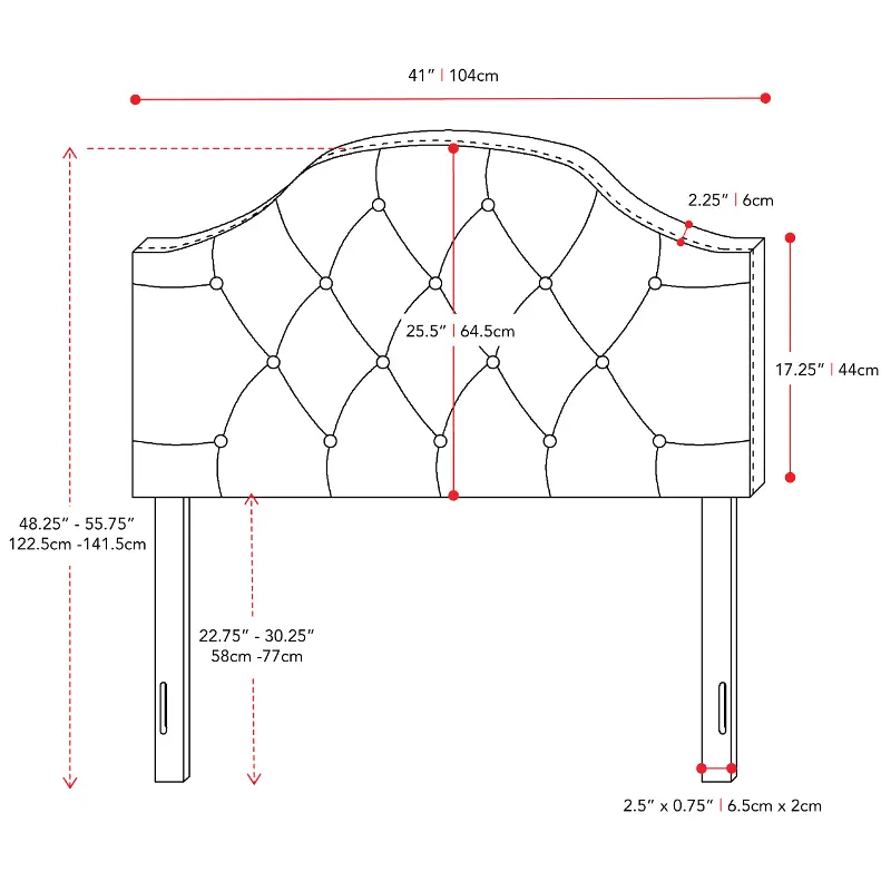 A diamond button tufted design with soft lines and a smooth arched silhouette that will be sure to impress. Beautifully upholstered in a soft fabric, this versatile, low-profile headboard is equipped with easy-to-adjust legs to accommodate your bed and frame.