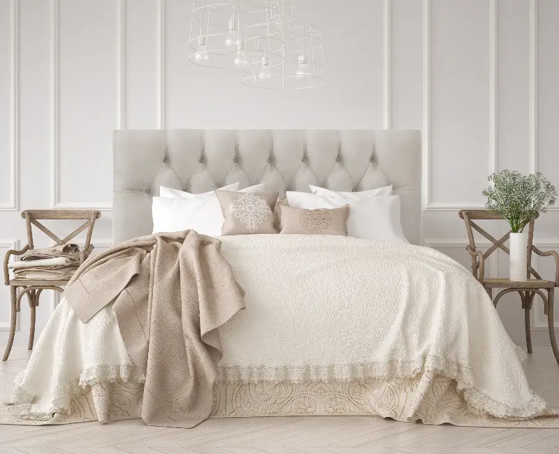 - Diamond patterned button-tufting on headboard