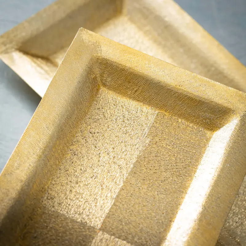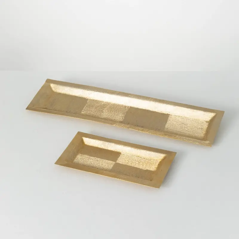 Veiled in a beautiful brushed gold finish, this pair of rectangle metal trays are the perfect size and scale for today's modern home.