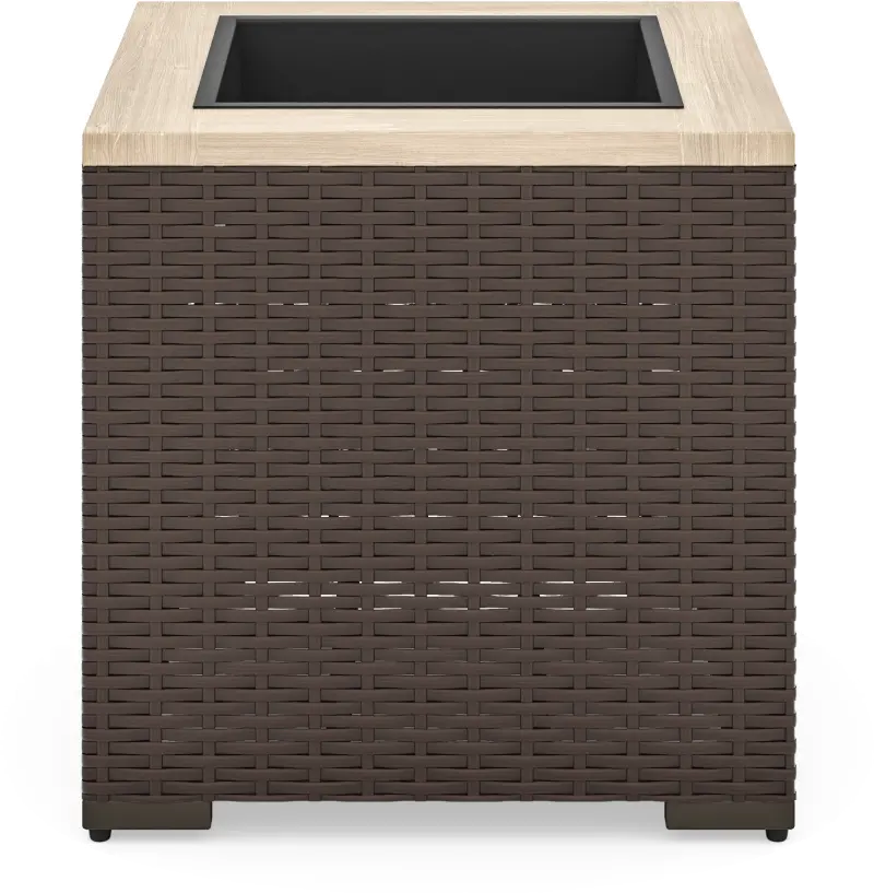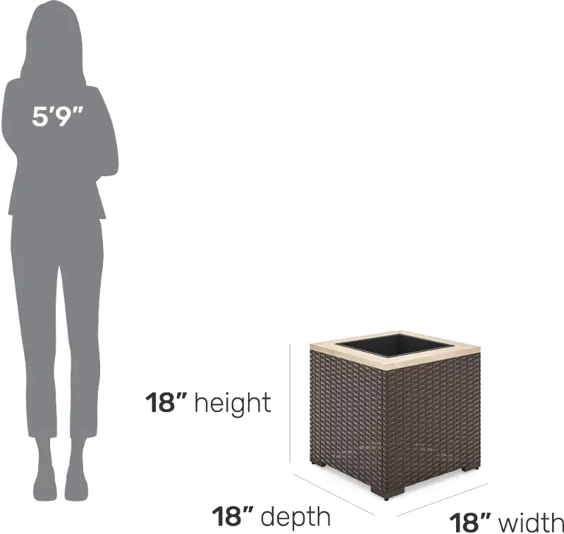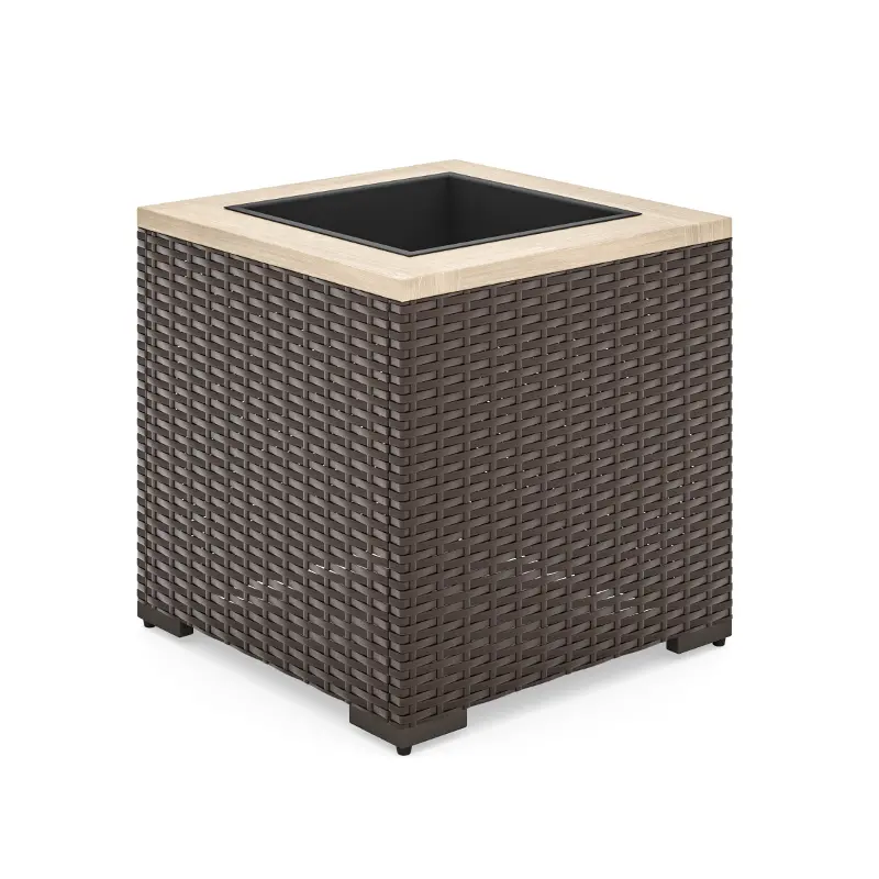 The water-resistant Acacia wood top includes a plastic planter insert with a hole for easy drainage for small plants. Remove the insert to fill with a larger plant. Perfect for indoor or outdoor use, the all-weather rattan is hand-crafted by artisans to deliver solid performance year after year.