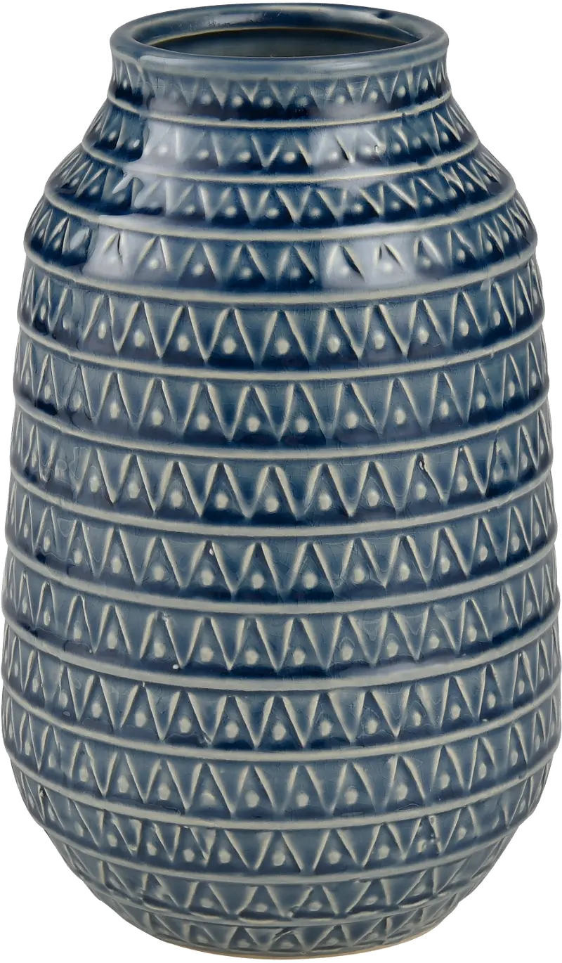 Rows of triangles and raised dots give dimension to the blue glazed surface of the vase, which includes a cylindrical body and tapered mouth opening.