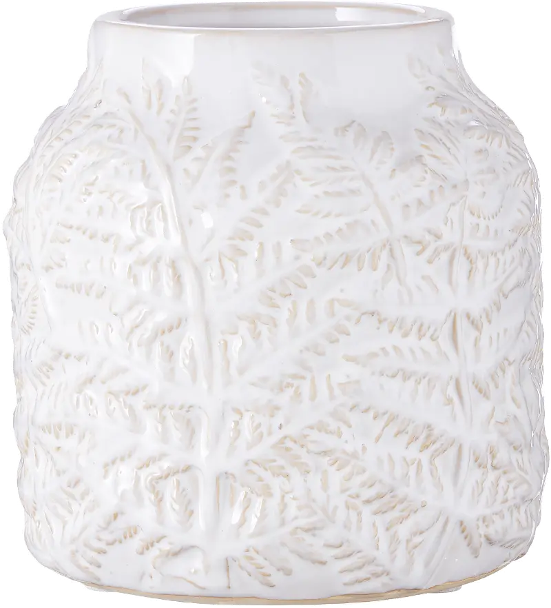 This white vase is embossed with an elegant leaf design that winds up from the base.