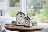 Reminiscent of a barn, this stylish gray and white lantern from RC Willey will add charm to your holiday or everyday decor.