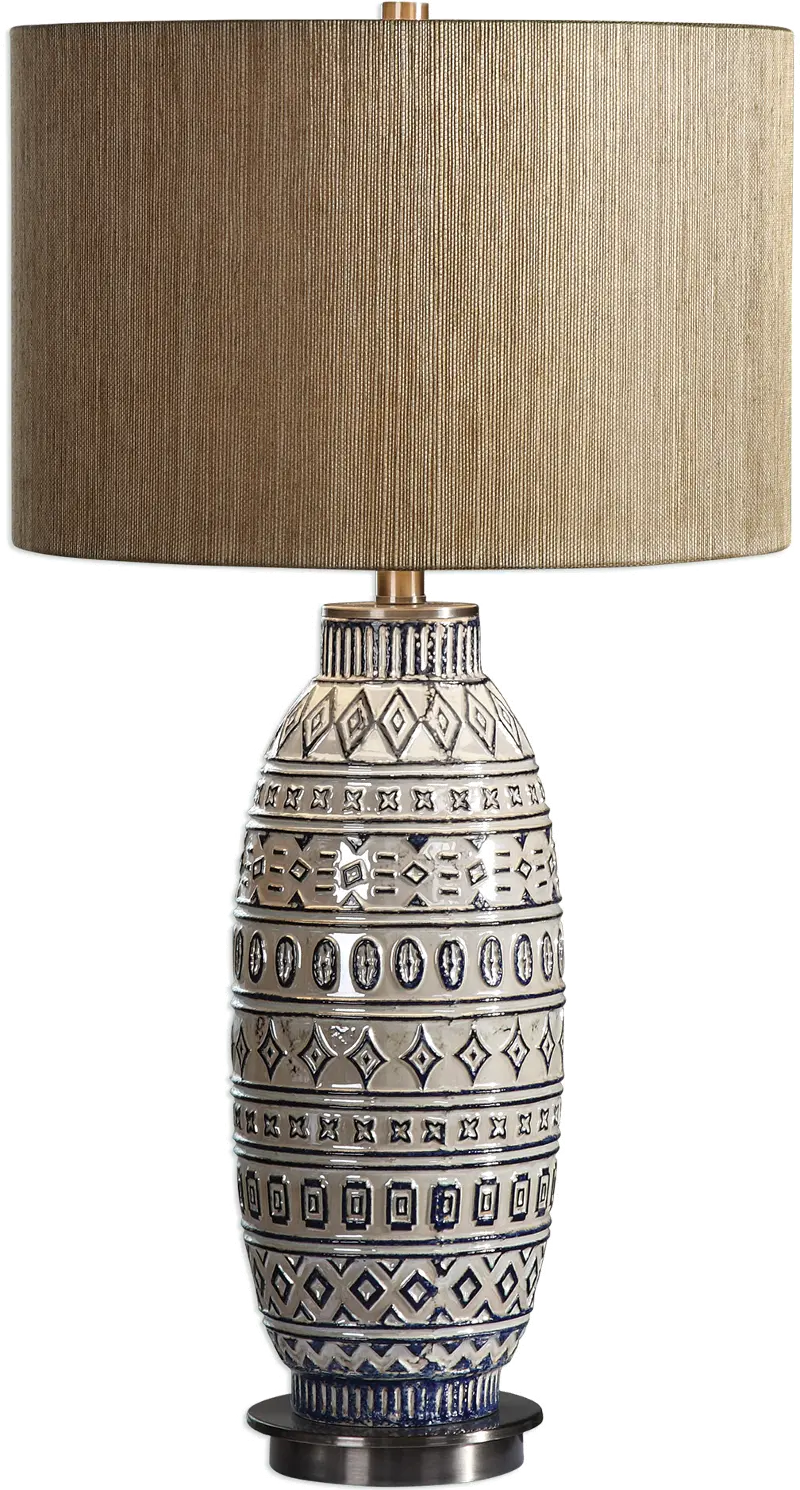 Finished in an aged ivory ceramic, this table lamp from RC Willey features textured and embossed tribal inspired details highlighted in deep blue.