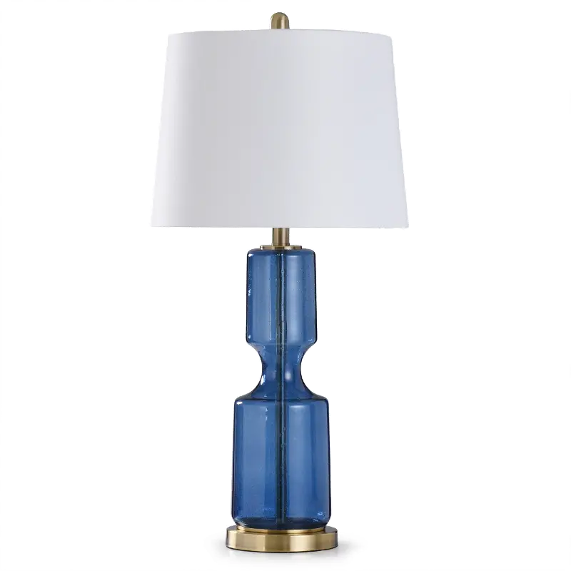 This navy blue table lamp from RC Willey is made of seeded glass showing the air bubbles throughout.
