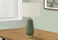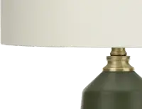 - This 26 inch contemporary table lamp with a green ceramic base and drum shaped ivory linen drum shade, finished with a gold finial on top, provides the perfect decorative accent lighting in a living room, home office, or bedroom, to end or side tables