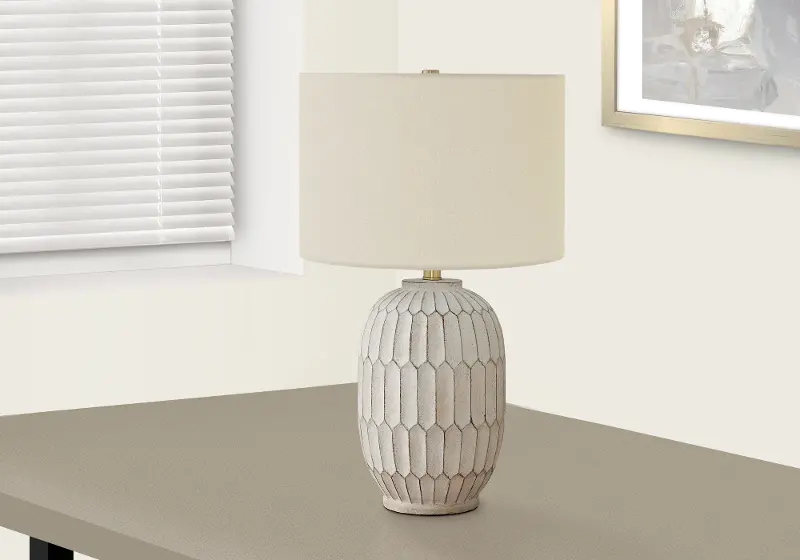Eclectic and eye-catching, this 24" table lamp will add enduring design to any room you place it in! It features a textured gray and cream resin vase-shaped base paired with a simple ivory linen drum shade with a gold metal finial on top.