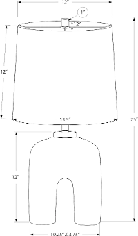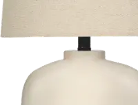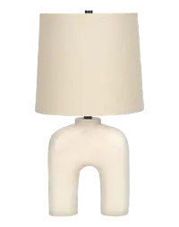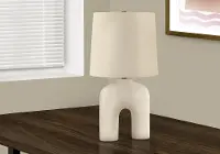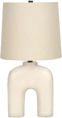 Bring modern whimsy to any room in your home with this eye-catching and stylish 25" table lamp. It features a unique cream resin arch-shaped base with a beige tapered drum shade and black finial on top.
