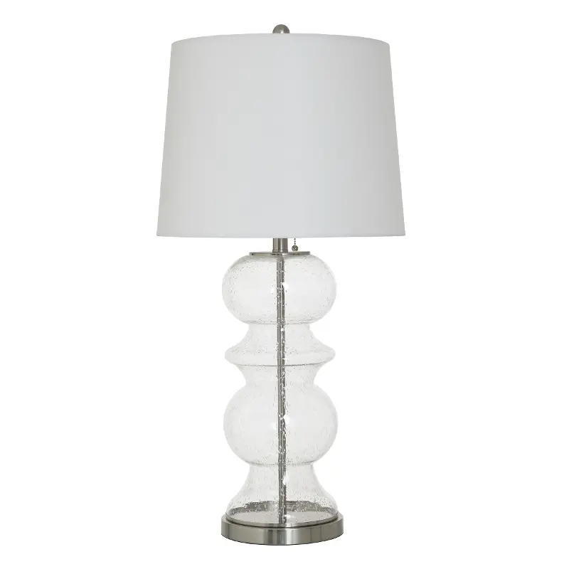 With its clear glass body, it is an ideal addition to any living room, bedroom, office, or entryway, adding an elegant touch while providing the practical function of lighting. Its fabric shade and durable steel base ensure longevity, and an LED light bulb provides energy-efficient illumination.