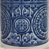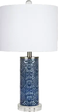 This unique ceramic table lamp showcases a stylish ceramic cylindrical body featuring an embossed design in a bijou blue finish atop a round slab of genuine crystal.