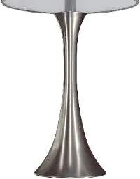 This contemporary table lamp set showcases an eye-catching hourglass figure with a dramatic flaring bottom half, all in a beautiful brushed nickel finish.
