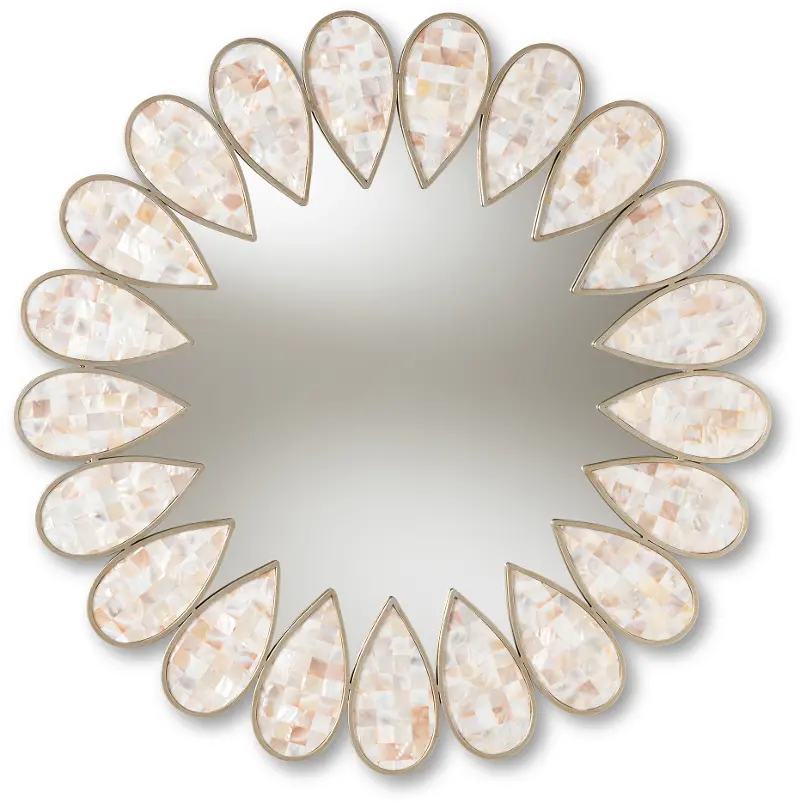 This contemporary mirror is constructed from MDF wood and features an antique silver-finished frame. Incorporating elements of nature, the frame is composed of petal shapes inlaid with pearl shell. As a result of the varying properties of the shells used, each mirror is unique.