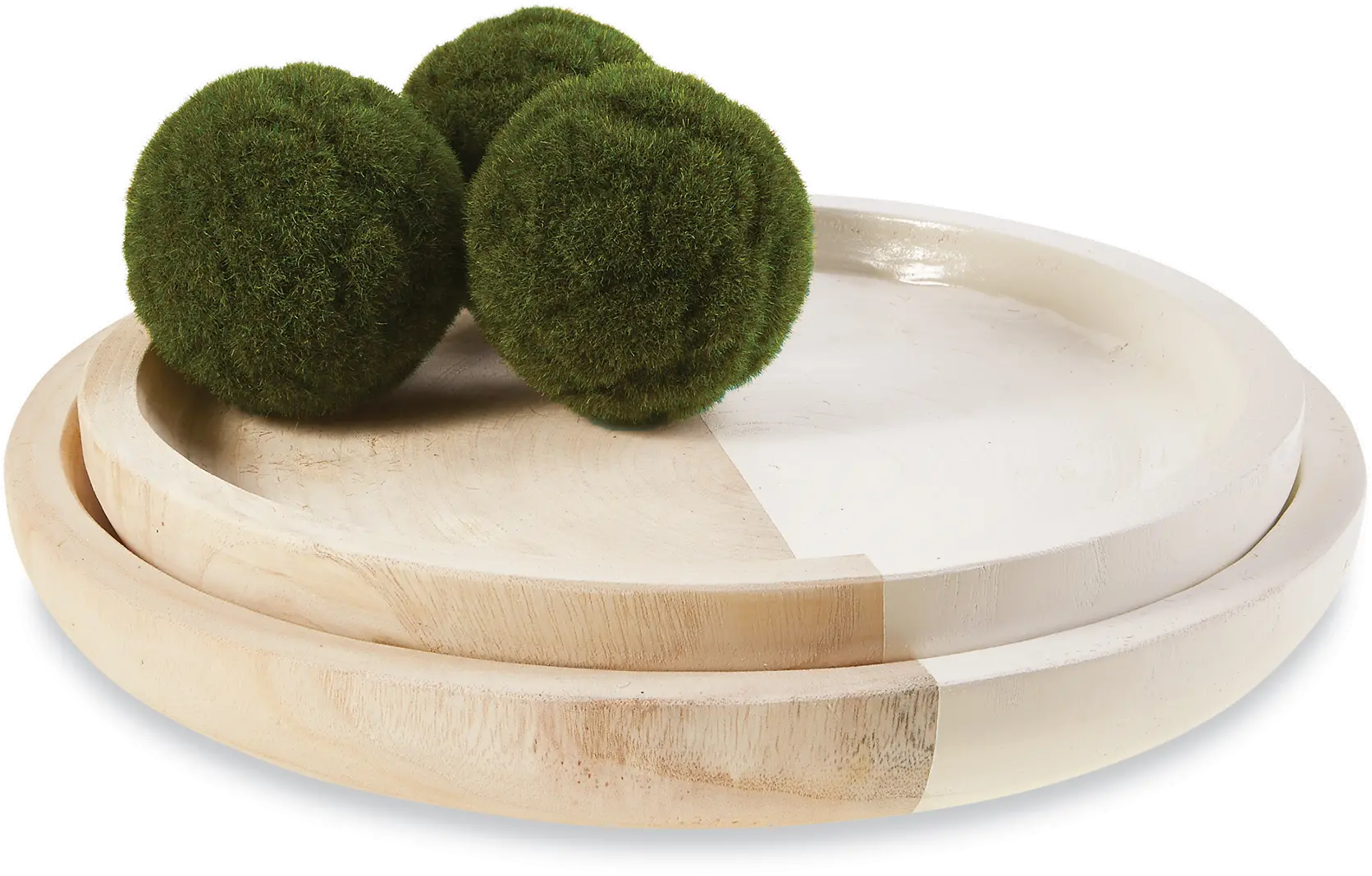 This round paulownia tray from RC Willey features a contrast white hand-painted detail.