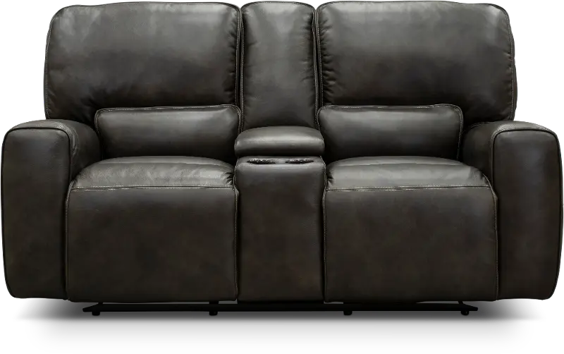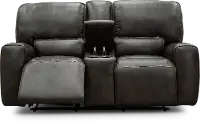 RC Willey now has this charcoal gray leather-match power reclining loveseat with console, the piece you've been searching for!