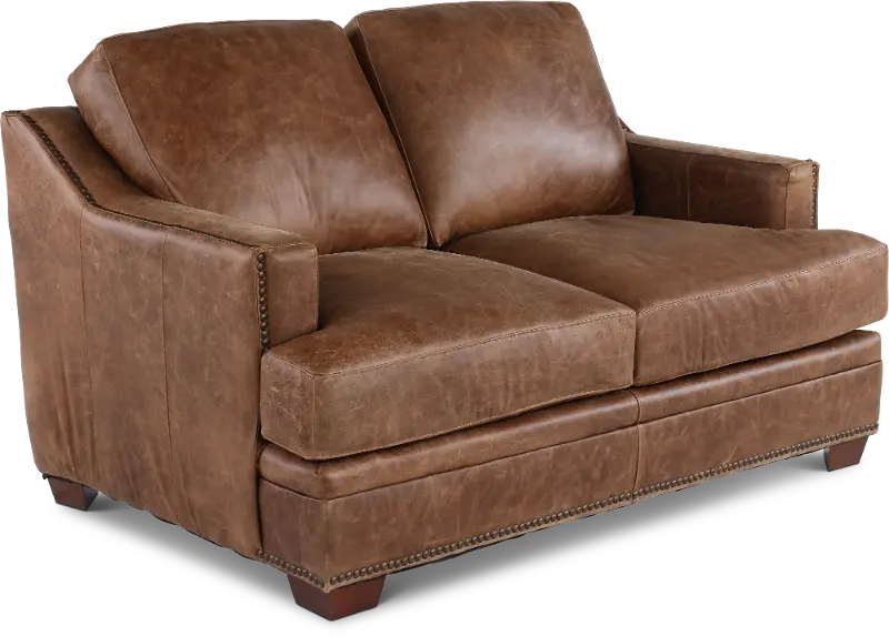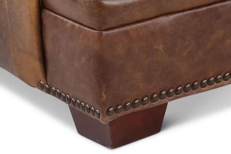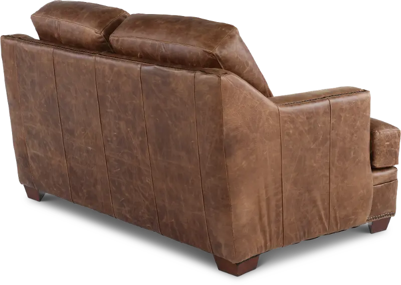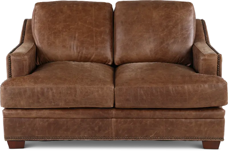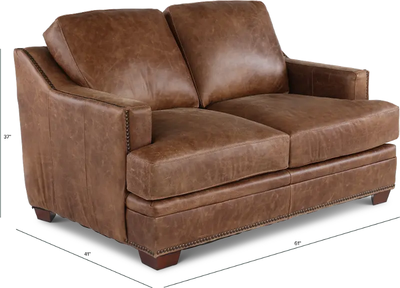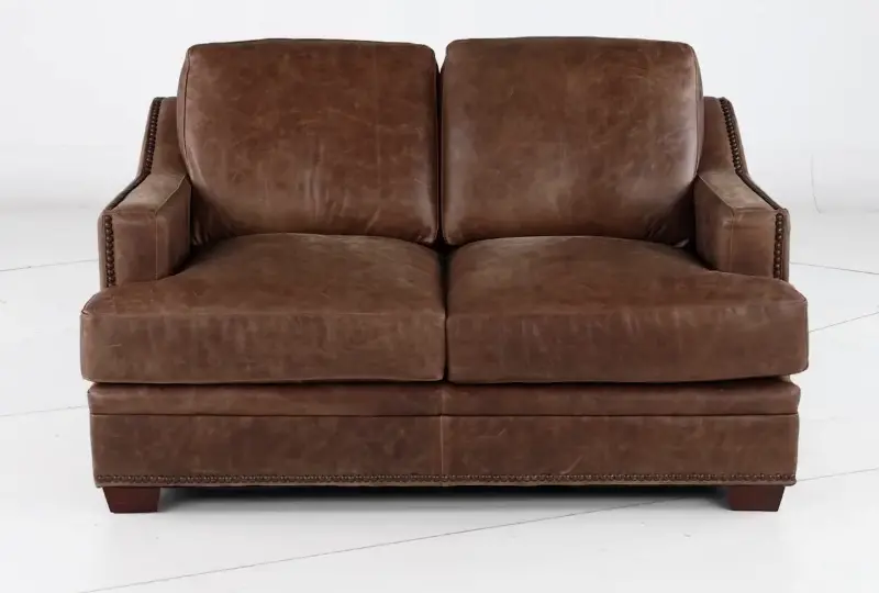 The loveseat's clean silhouette is enhanced by sleek track arms and nail-head detailing along the base. Its upholstered in an ancient brown full top grain aniline leather that offers a crackle effect that will deepen in character over time. This loveseat's true 8-way hand tied coil spring construction provides more balance for comfortable seating, while genuine down-blend seat cushions makes lounging hard to resist! You'll love how effortlessly the Antique brown leather collection will enhance your existing furniture pieces, creating a stylish, comfortable, and ideal gathering place for your family and friends.