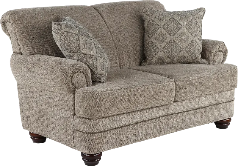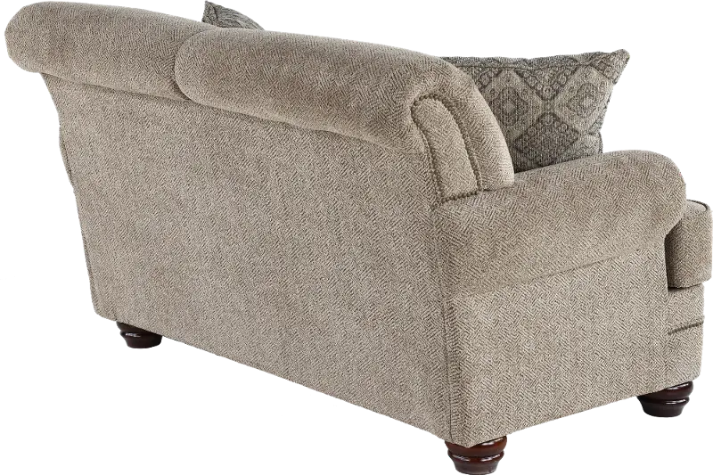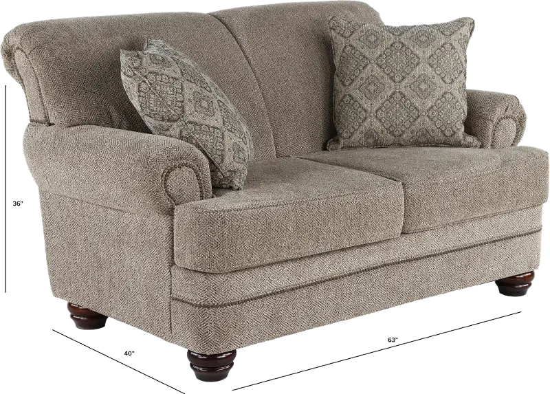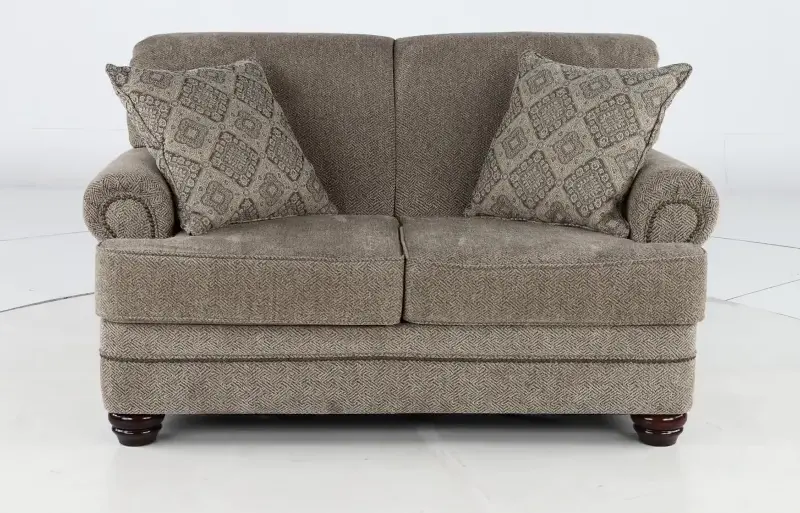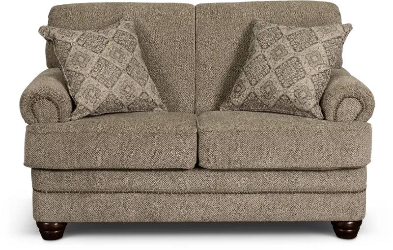 This loveseat's enduring silhouette with charming curves and subtly rolled arms is sure to enhance both formal and informal living spaces. Its neutral upholstery is beautifully accented with 2 toss pillows and time-honored nail-head trim.