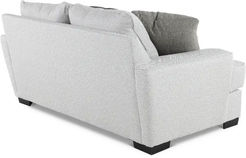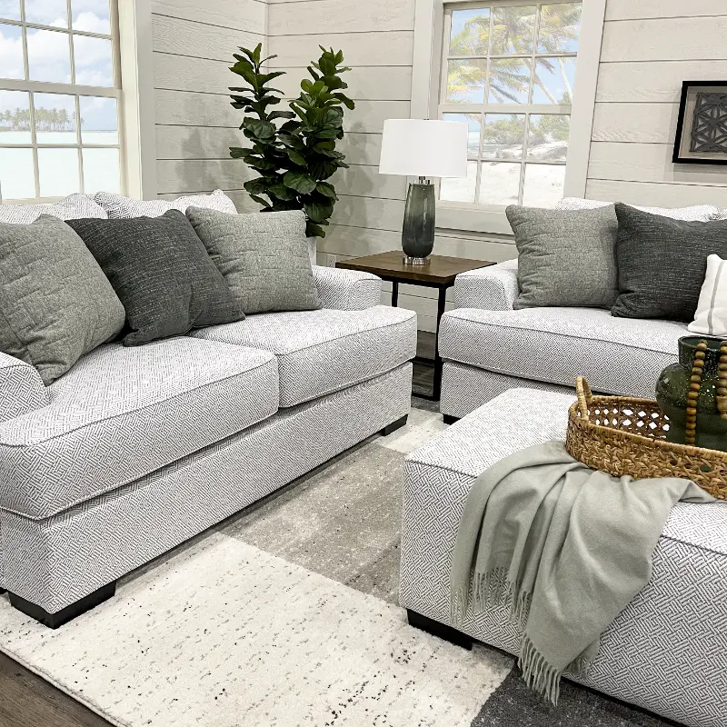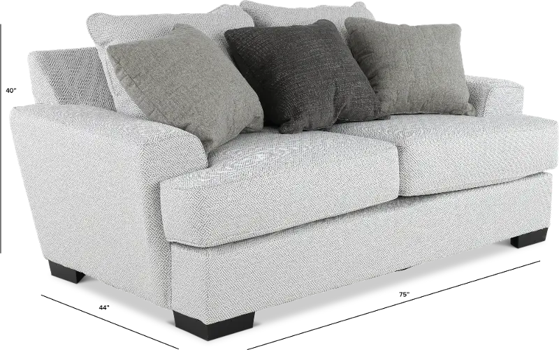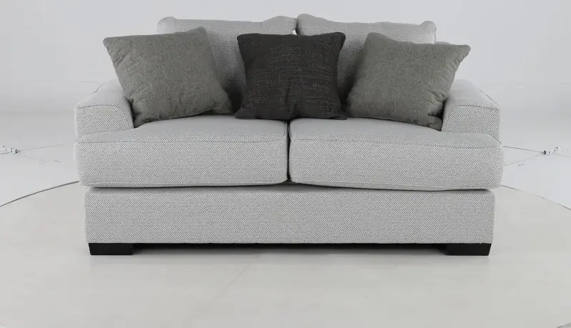 The loveseat’s wide square arms pair nicely with its deep seating and plush cushions, setting an inviting backdrop for lounging. Its pewter gray upholstery is neutral and fresh and handsomely complemented with 3 included toss pillows.