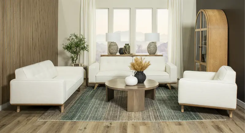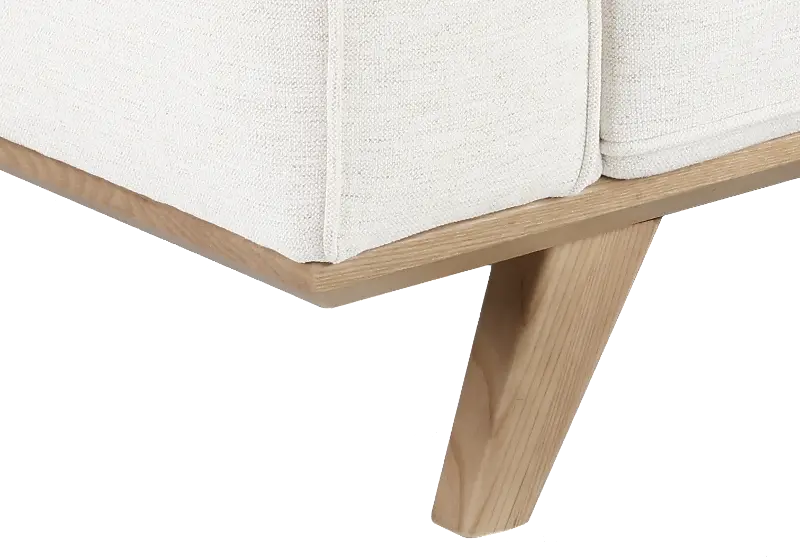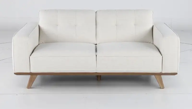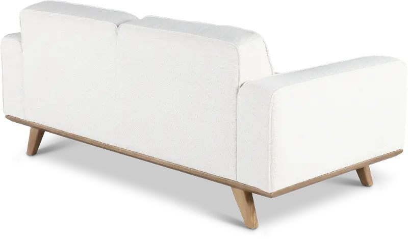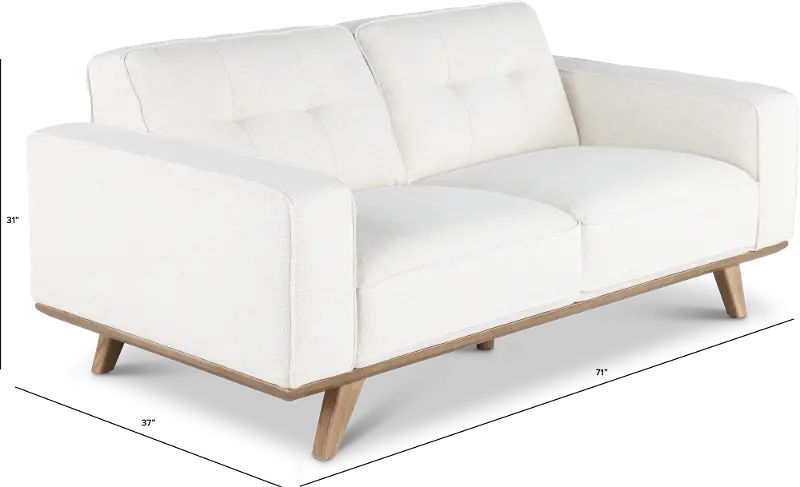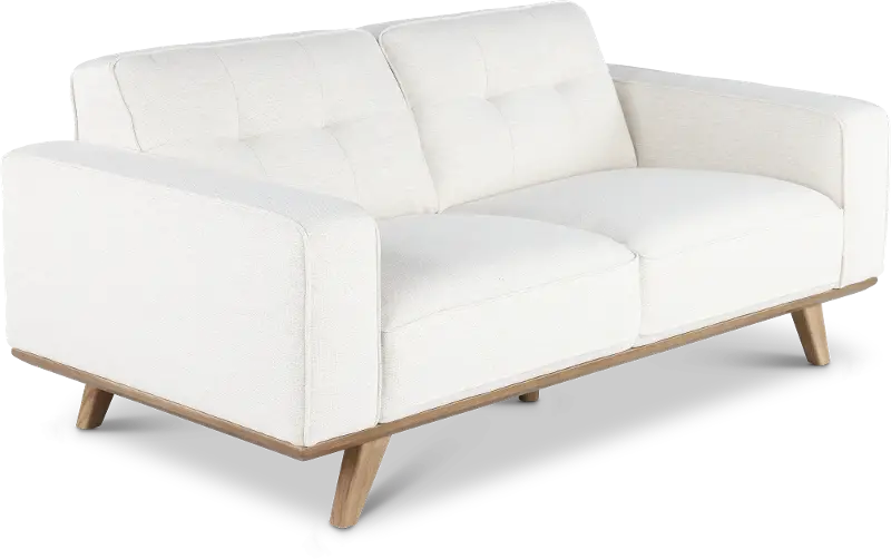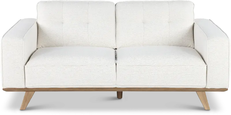 The loveseat features a streamlined silhouette with wide track arms covered in a breezy snow-white fabric with simple tufting along the back cushions. Its lightly finished wood base and legs lend texture and a relaxed feel.