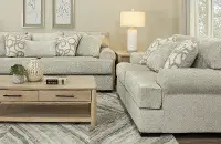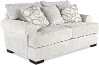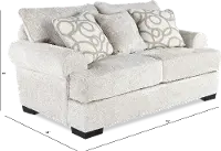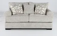 Solidly crafted, this loveseat offers luxurious comfort and timeless style with plush cushions, airy gray upholstery, and eye-catching toss pillows. Extra-deep seating makes it the perfect spot for unwinding with family and friends.