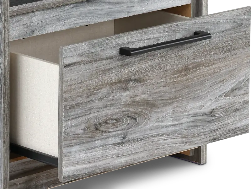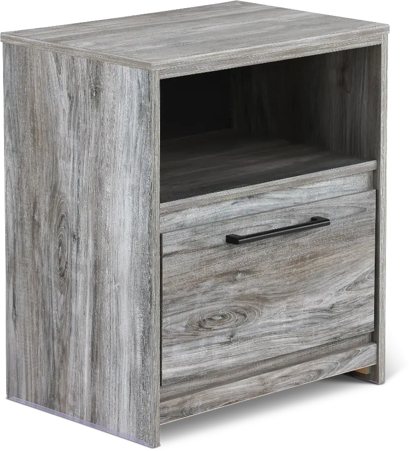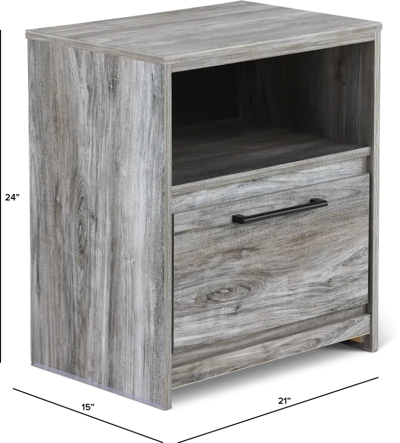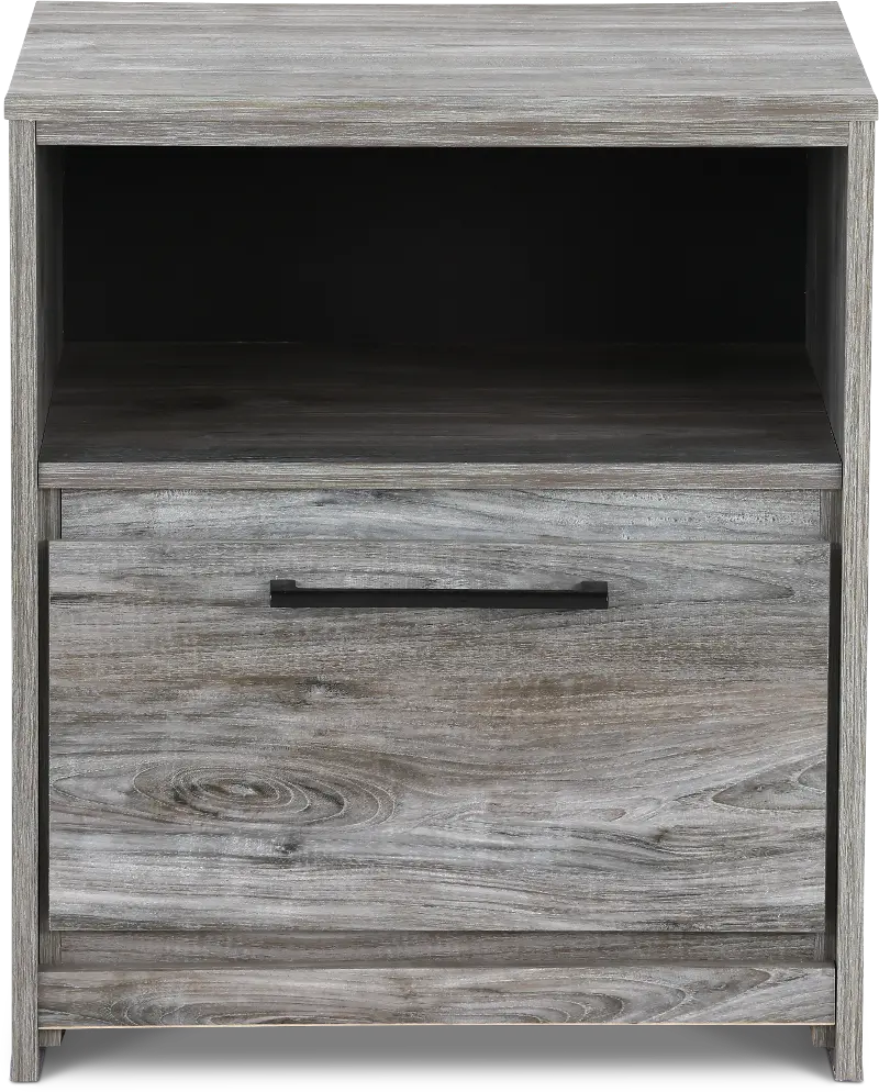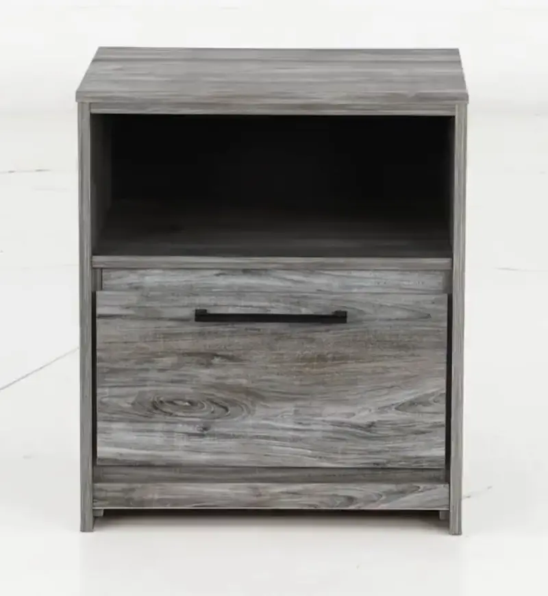 Its contemporary silhouette features a smoke gray finish over replicated oak grain that lends a touch of rustic appeal. Smartly designed, it offers a slim-profile USB charging station to keep all your devices closet at hand. The nightstand also features 1 smooth-gliding drawer for easy opening and closing and 1 cubby perfect for keeping bedside necessities within easy reach. A linear drawer pull with antiqued gunmetal-tone finish complements the nightstand's laid-back style. The Twila collection's chic charm and versatile beauty make it an ideal fit for a variety of tastes and spaces!
