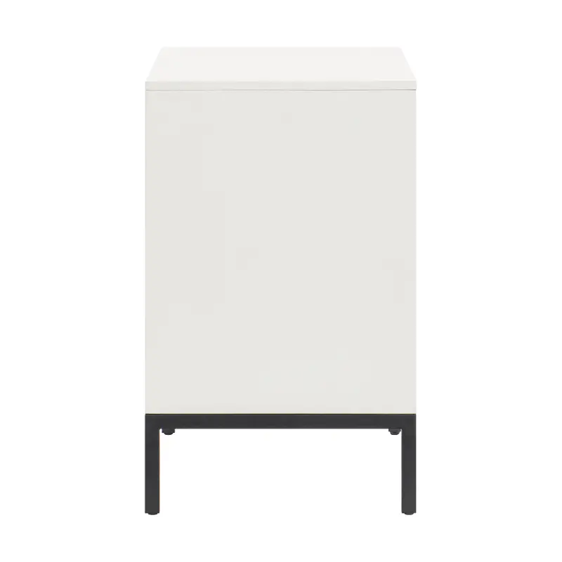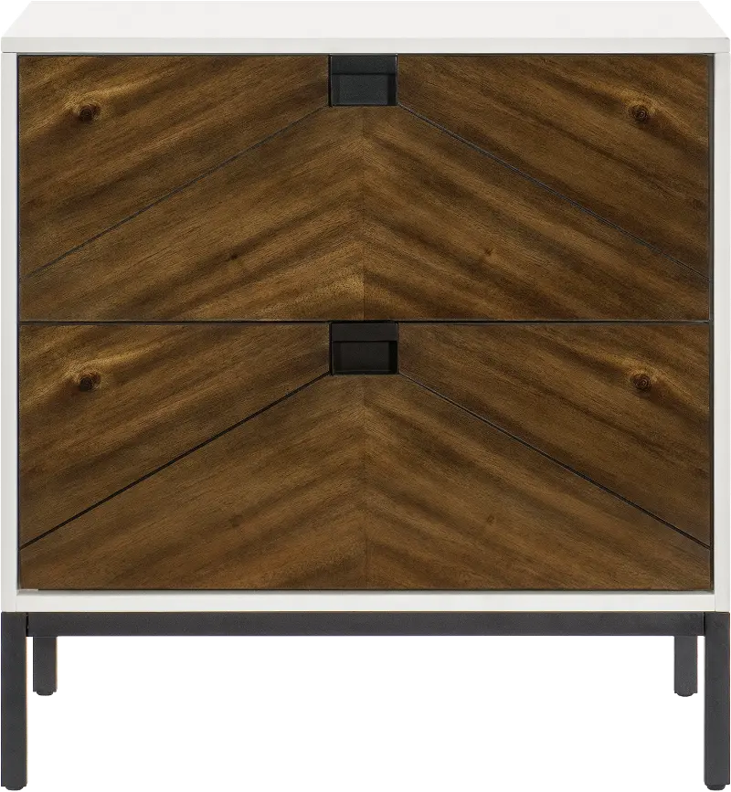 Sturdily crafted, this nightstand features unique v-pattern drawer fronts finished in warm walnut, providing a chic contrast to the bright white finish of its frame. Metal legs and drawer pulls further enhance its visual charm. Its 2 soft-close drawers provide generous and handy storage for all your bedside necessities.