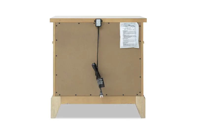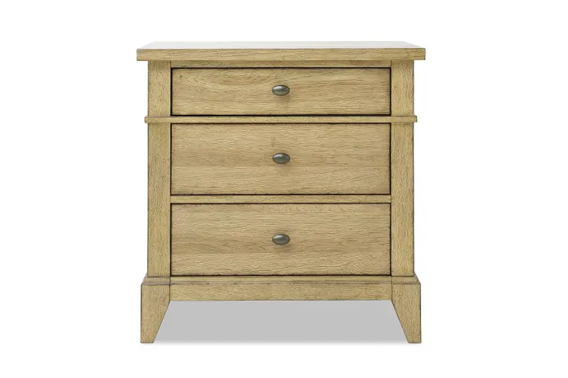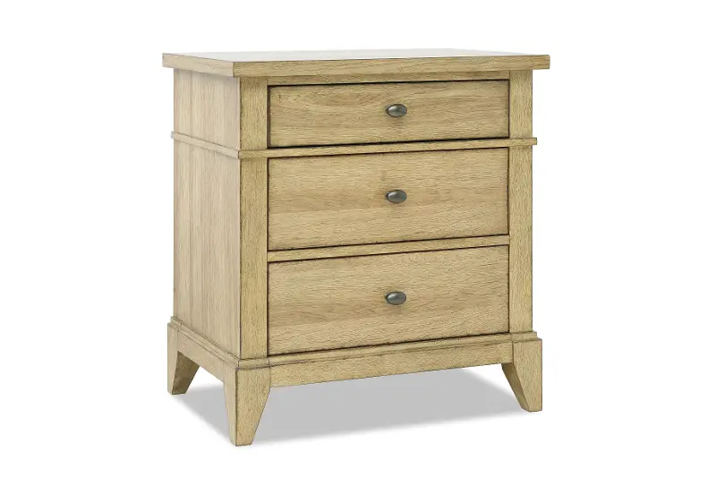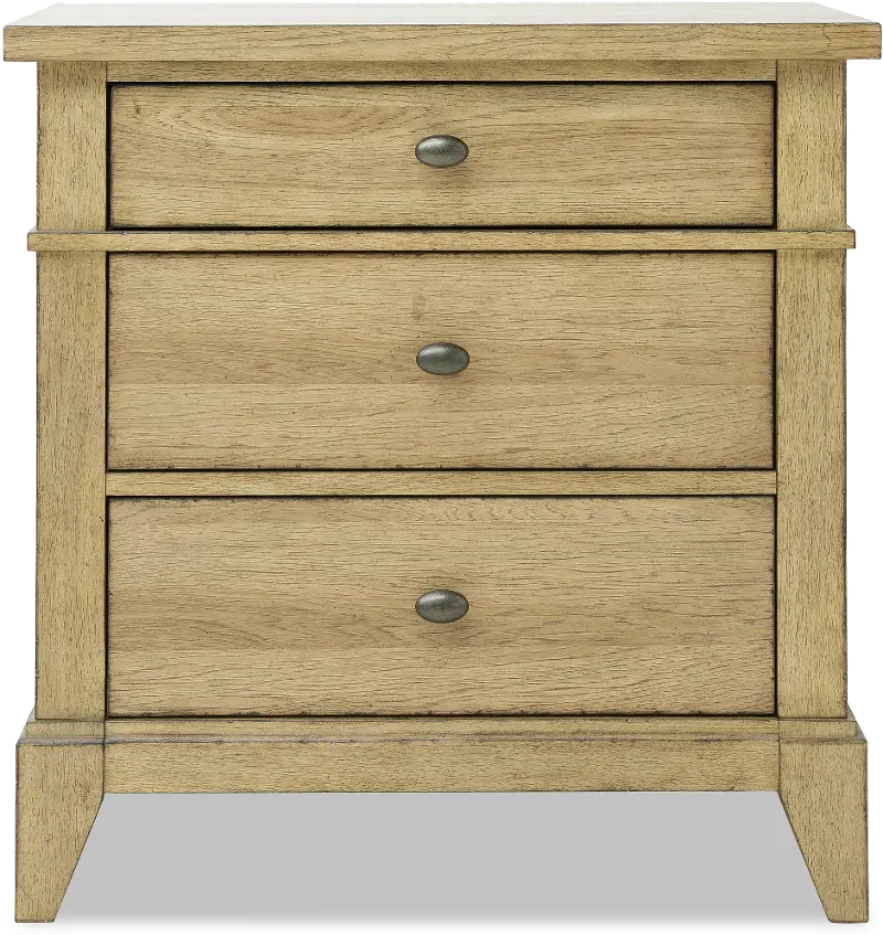 Sturdily crafted, this nightstand features a warm and timeless natural hickory finish with soft distressing. Its 3 drawers and USB/C charging port provide bedside storage and convenience, while oiled bronze drawer pulls complete its time-honored look.