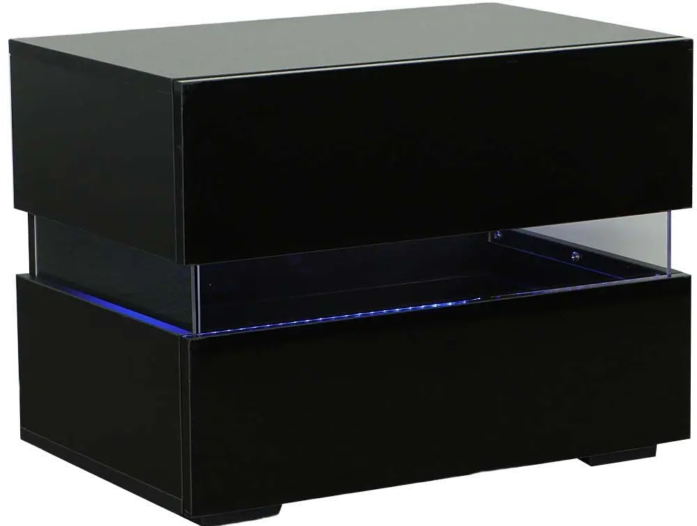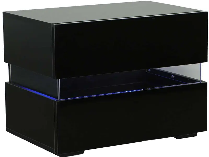 This black nightstand offers 2 drawers, a clear acrylic center, and LED mood lighting with 3 color settings of red, green, and blue operated with an included remote. The melamine veneer is easy to clean, and its low-profile height is perfect for more modern settings.