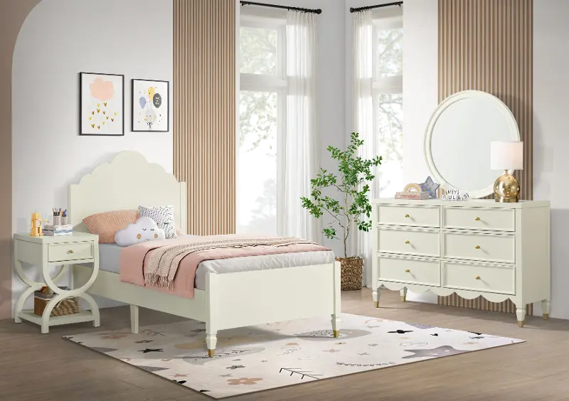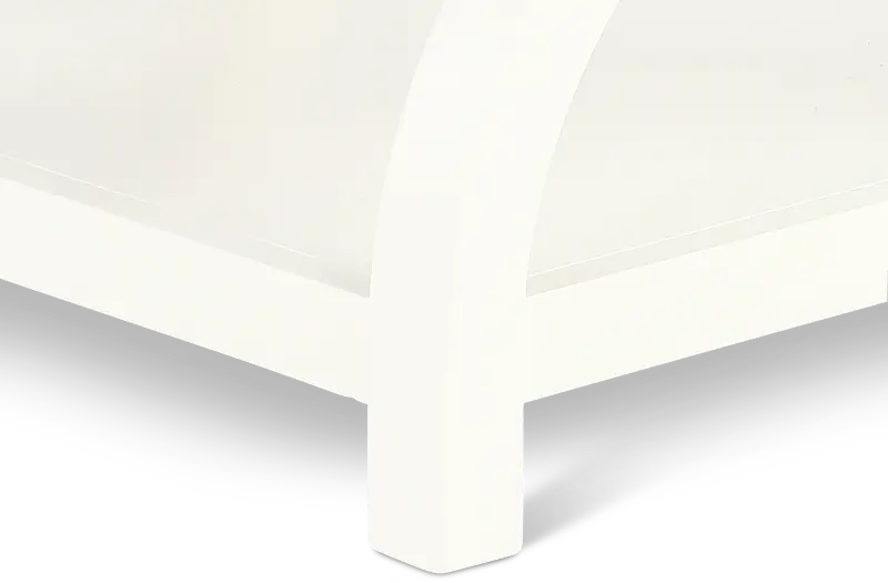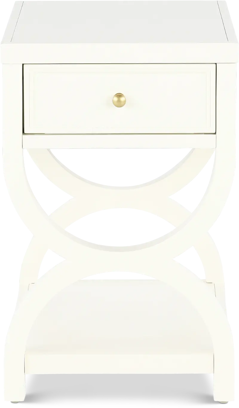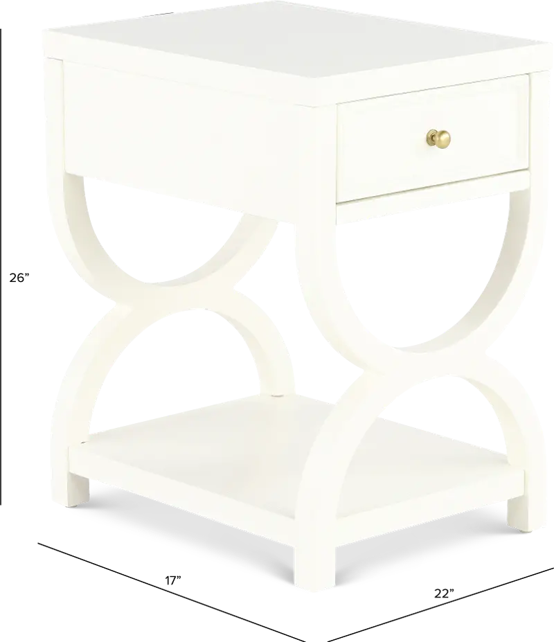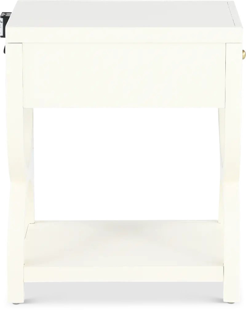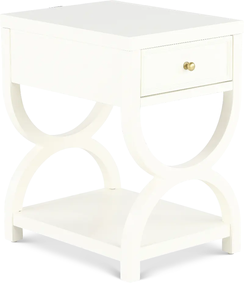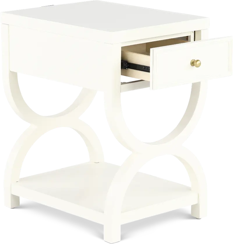 Expertly crafted, this single drawer nightstand with USB charging features a simple yet elegant French white finish. Its eye-catching silhouette offers clean lines and gentle curves, while scalloped detailing and golden-hued drawer pulls enhance its graceful appeal.