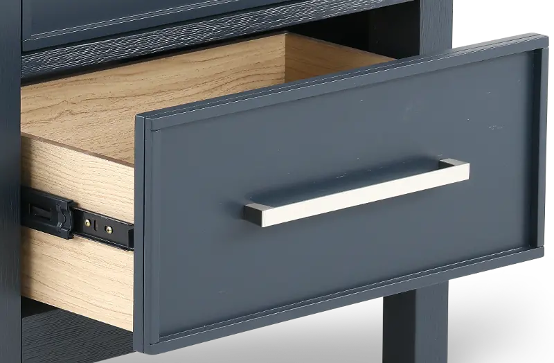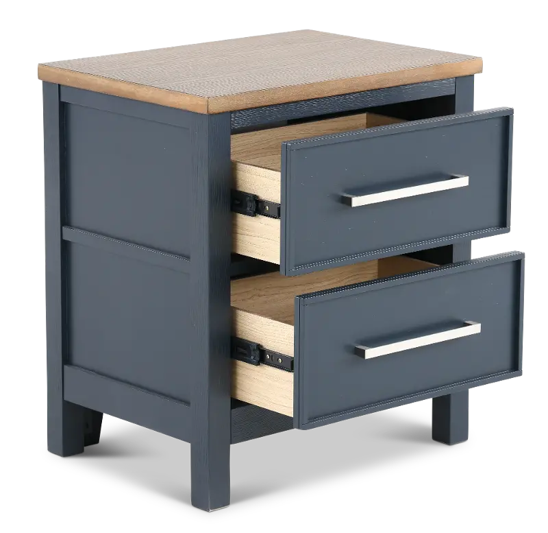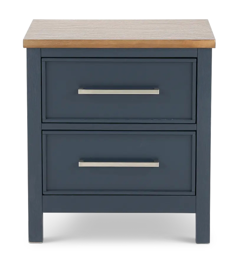 The nightstand blends a simple silhouette with a two-tone blue and dark brown finish, bringing comfort and balance to any bedroom space. Its 2 drawers provide generous bedside storage and feature ball-bearing glides for smooth operation and sleek nickel-finished drawer pulls.