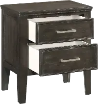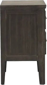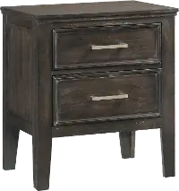 Solidly built, this nightstand features a rich nutmeg brown finish with sand-throughs and white glazing for a weathered look, highlighting the wood’s unique grains and characteristics. The 2 smooth-gliding drawers provide handy bedside storage, while framed drawer fronts and elongated metallic-finished handles lend depth and charm.