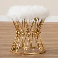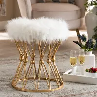 Glam White Faux Fur Upholstered Ottoman with Gold Metal Base