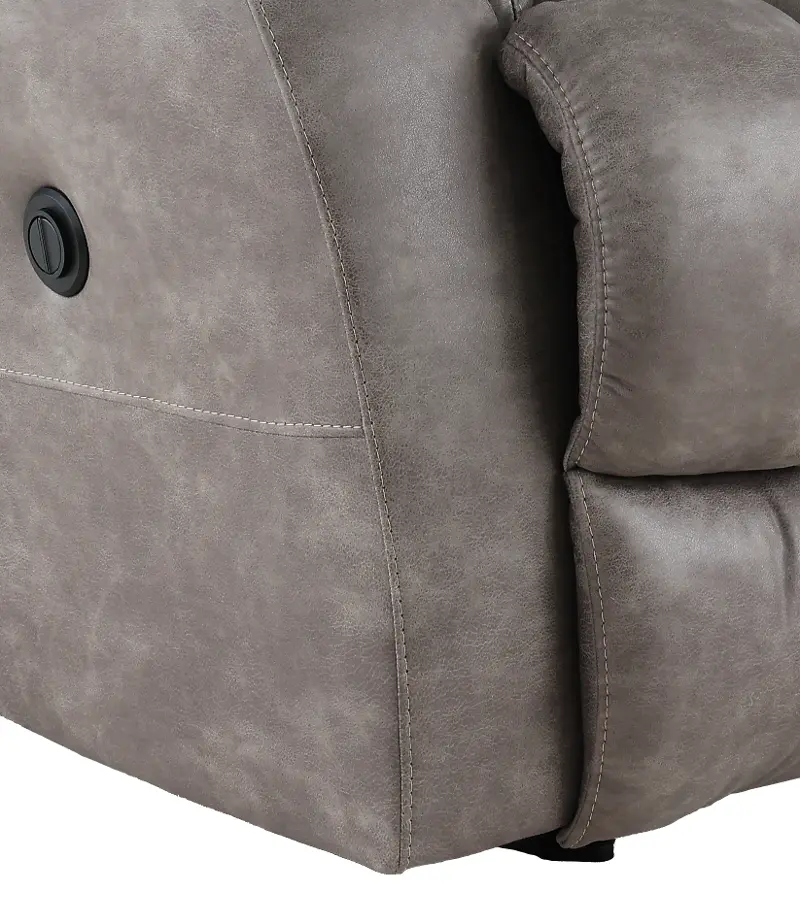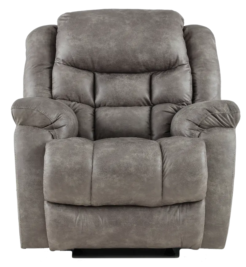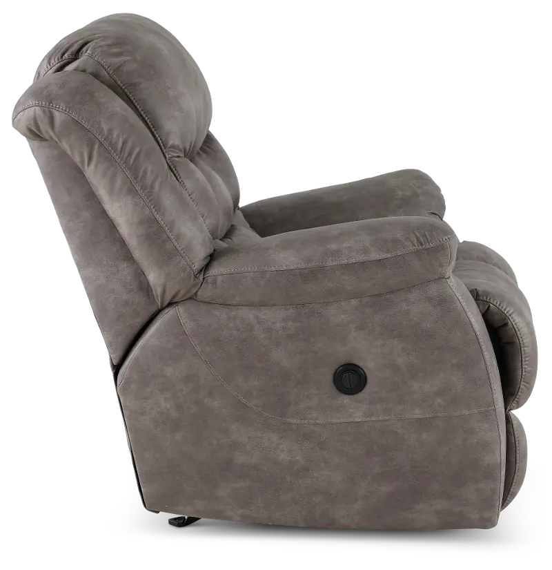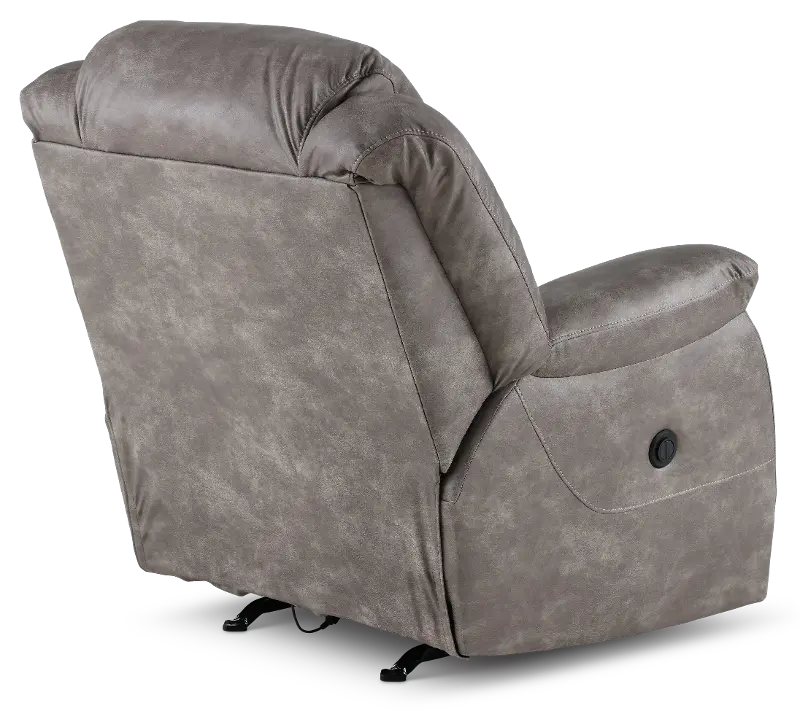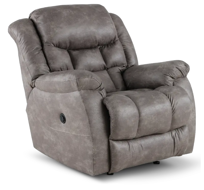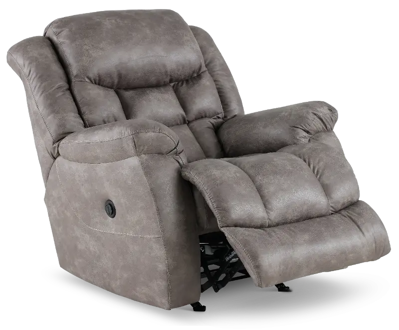 This pewter gray power rocker recliner from the Blockbuster collection is ready to help you relax. This recliner is a large-scale, contemporary design featuring plush, pad-over-chaise seating and solid foam arms for ultimate comfort. The 100% polyester cover with an attractive accent stitch is durable and easy to maintain, making it very family and pet-friendly. Proudly made in the USA, the Blockbuster is made of the highest quality at a competitive price to last you years to come.