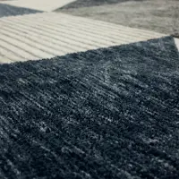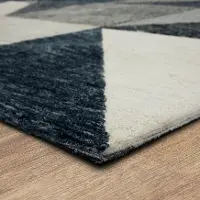 Check out the geometric, multi-colored rug designed specifically for the Drew and Jonathan Home Oblique Collection by Karastan. With a versatile blue and gray color palette, this machine-knitted rug is made from 100% polyester, making it easy to clean. And with a soft, plush pile, it's just the right mix of comfort and style for any home.
