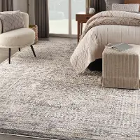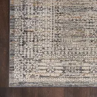 Presented in ivory, slate blue, and gray, the elaborate pattern is finished with fringe edges and an abrash effect that mimics the look of a one-of-a-kind vintage rug. Machine-made from durable, easy-clean fibers enhanced with high-low textured accents.