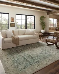 The Sinclair Jade rug from Magnolia Home by Joanna Gaines x Loloi is power-loomed of polyester, including 58% Global Recycling Standard (GRS) certified recycled polyester (made from recycled plastic bottles), certified by Control Union 1171944.