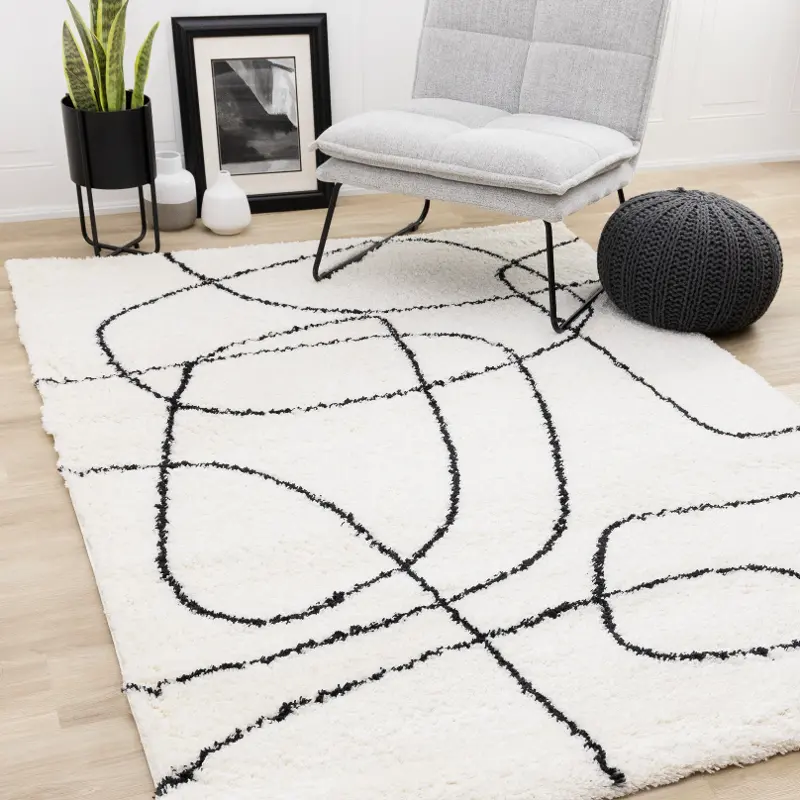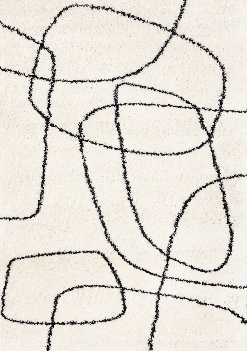Featuring bold, abstract black linework on a soft ivory backdrop, this rug adds a modern, artistic touch to any room. Machine-made with precision, the yarn-dyed and colorfast materials ensure long-lasting vibrancy and durability, even in high-traffic spaces. Its versatile design complements a variety of décor styles, making it a perfect choice for living rooms, bedrooms, or offices. Elevate your space with this eye-catching area rug today!