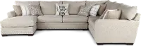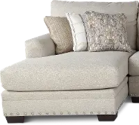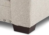 Its generous dimensions and inviting and fresh cement beige color make it an ideal backdrop for entertaining friends and family. Comfort coil seating featuring Comfor-gel makes relaxing hard to resist. Pewter decorative nail-head trim along base, wooden pyramid legs, and an eclectic collection of toss pillows add to this sectional's enduring, stylish appeal.