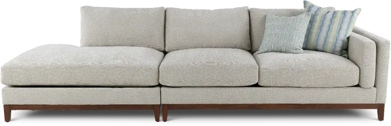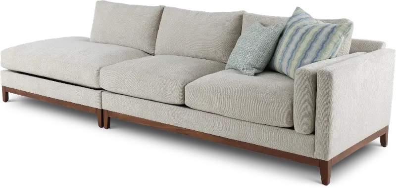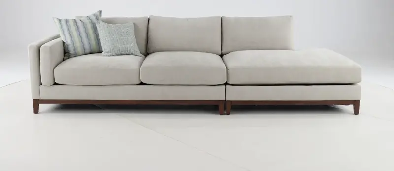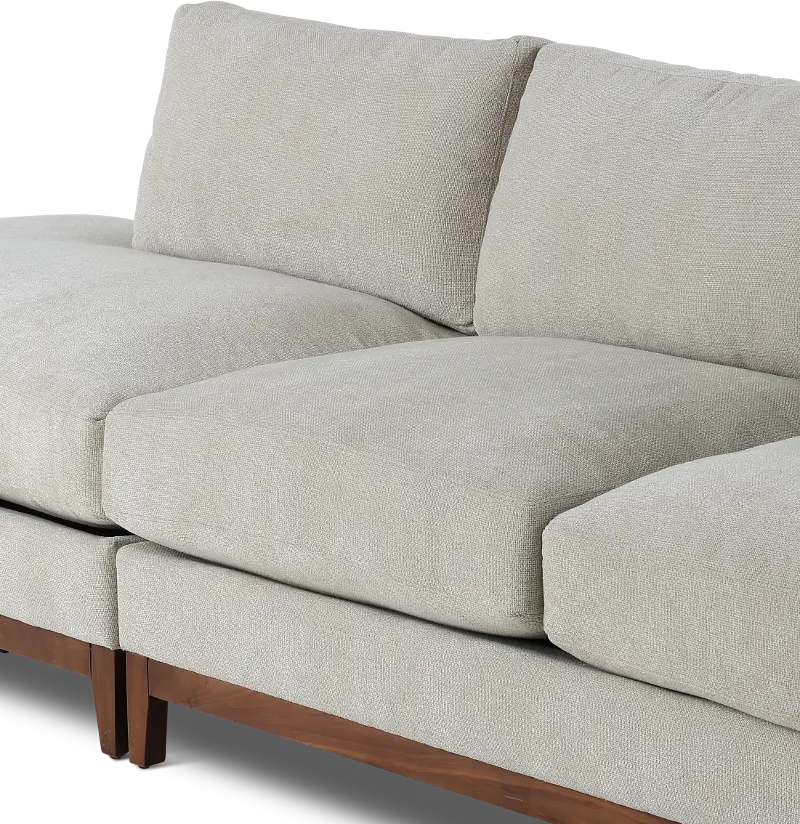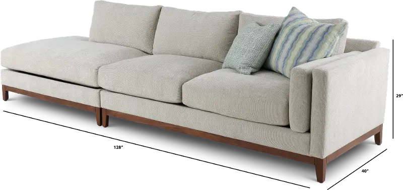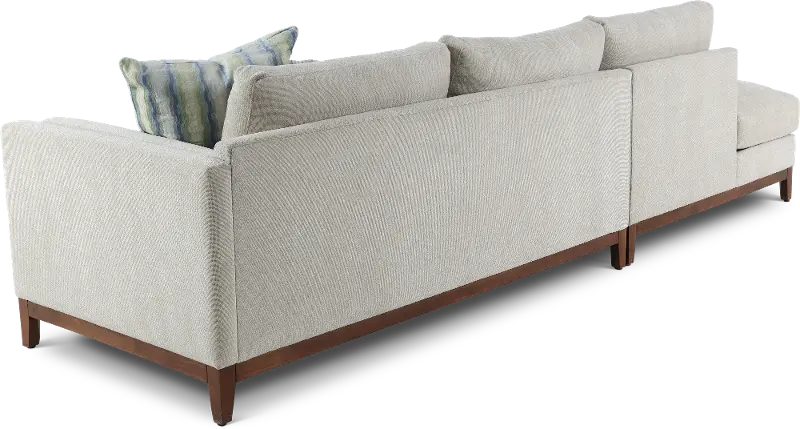 This 2-piece sectional is beautifully upholstered in a versatile dove beige color and accented with 4 contrasting toss pillows. Its refined and simple silhouette is artfully enhanced with a mid-century inspired wood base and legs that add character and a relaxed feel.