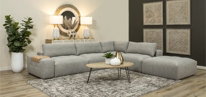 Includes 3 armless chairs, corner piece, floating arm piece with wood tray, and ottoman.