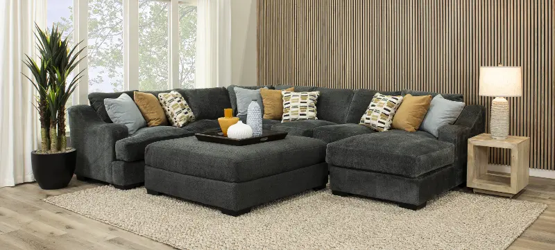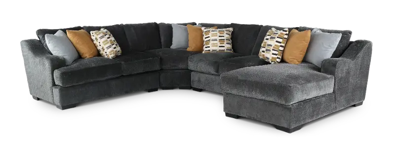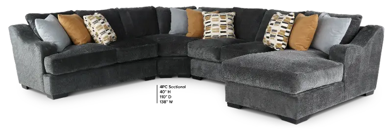 This 4-piece sectional features a contemporary yet versatile silhouette handsomely covered in durable and neutral-colored graphite gray fabric. Its plush cushions and deep seating set the perfect backdrop for stretching out with a good book or entertaining a crowd!