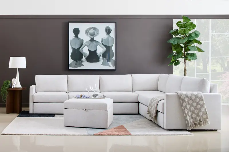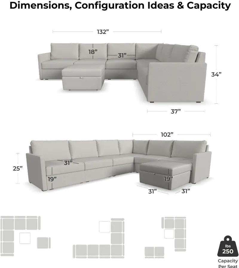 Designed for a lifetime of flexibility, the Flex 6-seat sectional with storage ottoman delivers reconfigurable relaxation for small and large groups.
