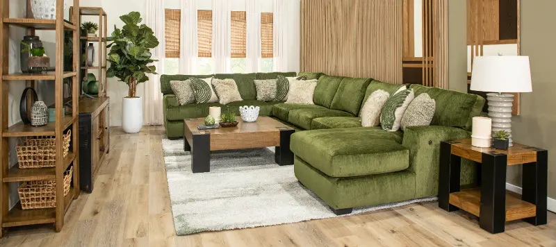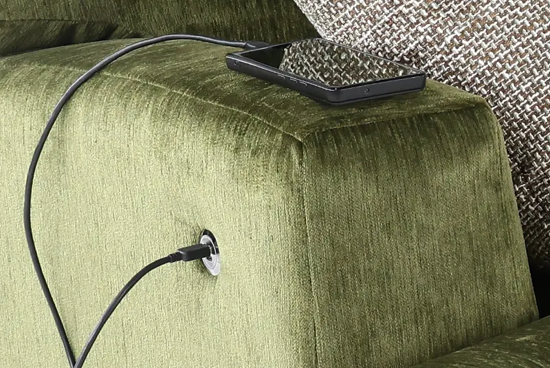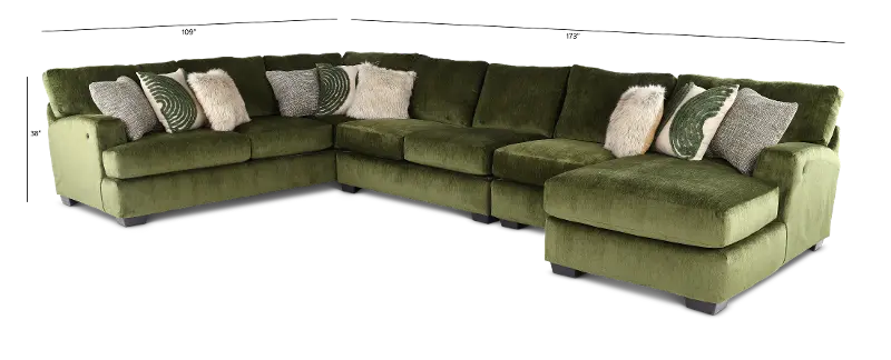 This 4-piece sectional offers a simple and chic silhouette covered in a richly hued green velvet chenille fabric. Handy USB-C ports are located on the exterior sides of each armrest, making it easy to keep devices fully charged and close at hand. The sectional's generous proportions, luxurious comfort, and universal appeal are ideal for gathering spaces, while 9 included toss pillows further enhance its inviting feel.