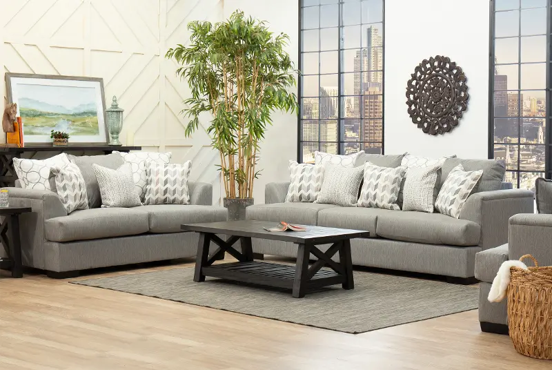 It features a fresh, contemporary silhouette that is both inviting and versatile. Its stone gray color makes it easy to blend in with, and enhance, your existing furniture pieces. Eye-catching toss pillows add depth and character. Whether you're entertaining friends or lounging with the family, the Passport collection promises to be a welcoming backdrop for your home.