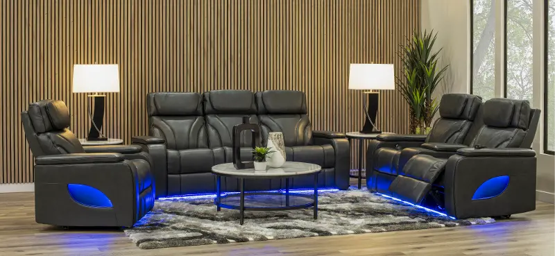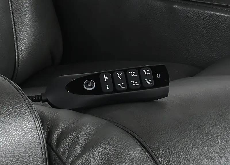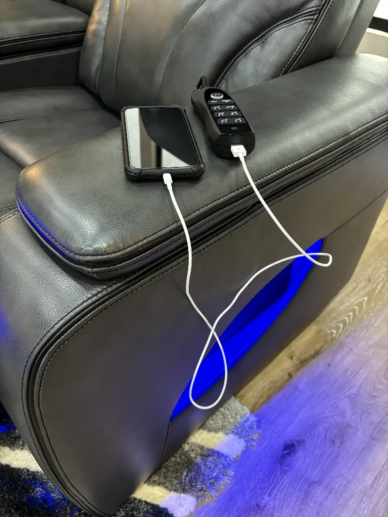 It is made from 100% top-grain leather and features air massage, power-adjustable headrests, and zero-gravity recline for ultimate relaxation. The center section folds down into a table with a reading light and charging ports, adding functionality to the style. Ambient lighting and built-in cup holders complete this sophisticated seating experience, perfect for a movie night in!