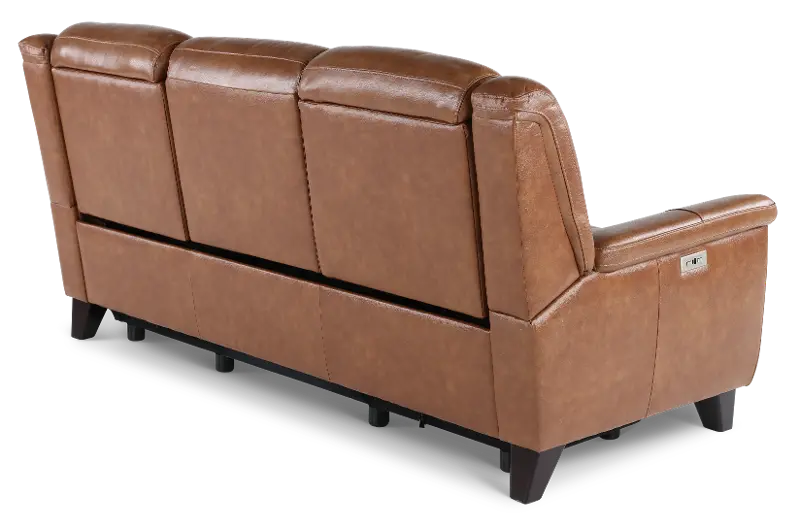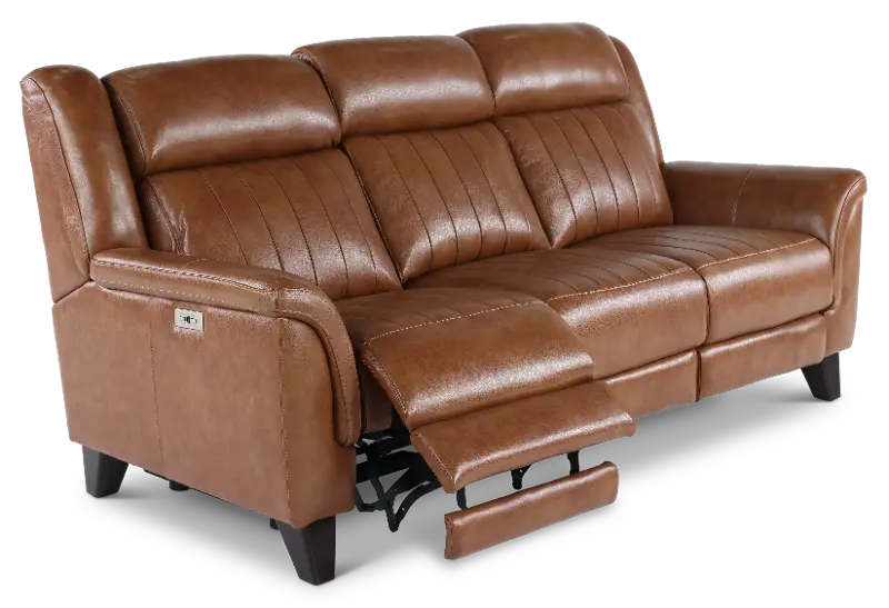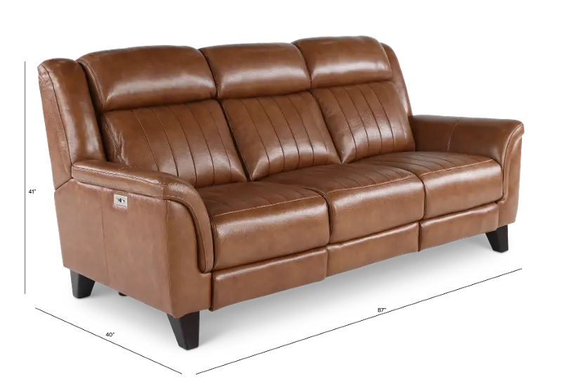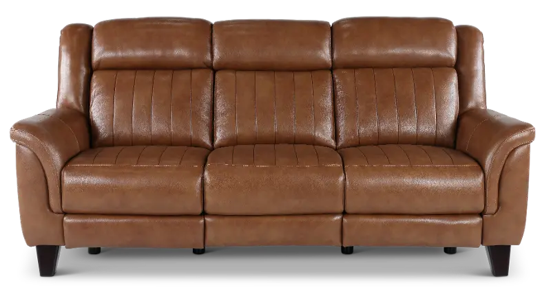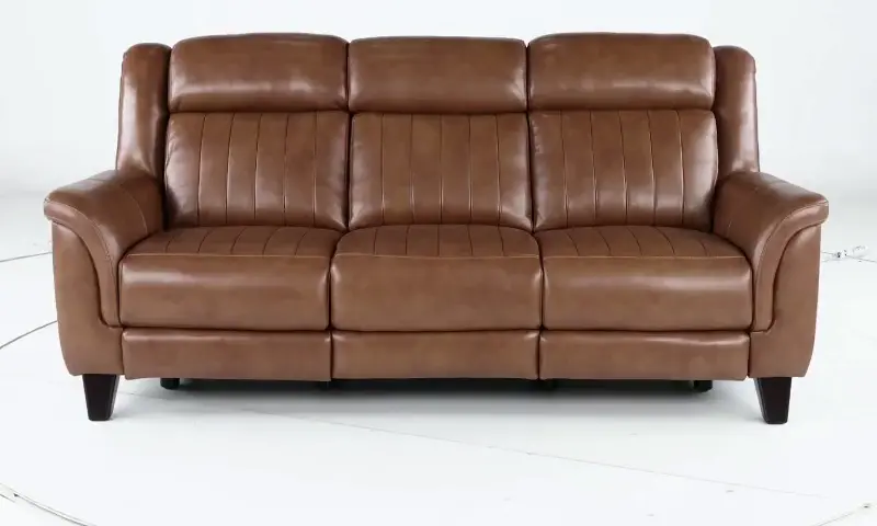 This sofa offers luxurious comfort with its caramel brown leather seating and plush pillow arms. Equipped with power recline and adjustable headrests, it allows for personalized relaxation at the touch of a button. And it includes a USB port so you can charge your phone or tablet while you relax. This sofa requires only 3.5 inches of wall clearance to fully recline, making it a versatile addition to various living spaces.