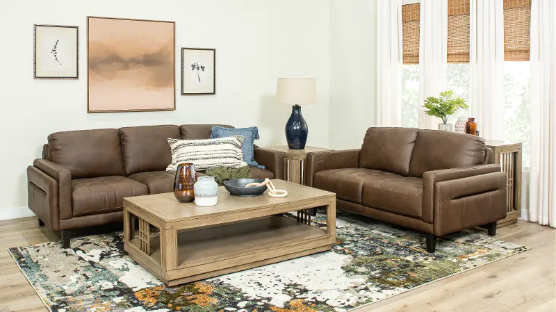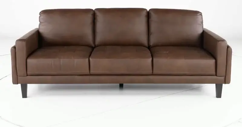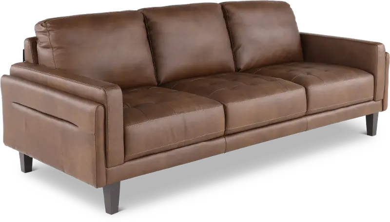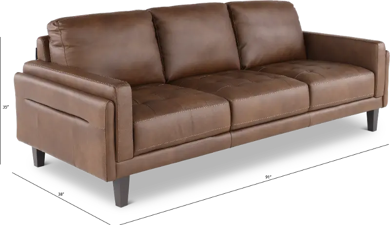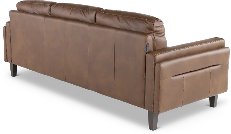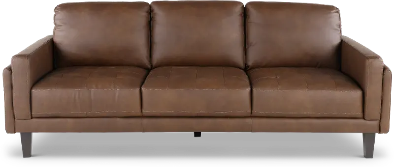 This sofa's unfussy silhouette draws inspiration from mid-century design and is artfully covered in brown-hued leather, adding welcoming warmth with a subtle pop of color.